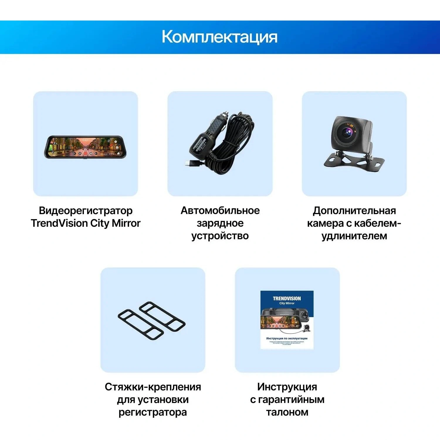 Видеорегистратор TrendVision City Mirror, Дополнительная камера с удлинителем, Автомобильное зарядное устройство, Резиновые стяжки, 3М скотч для задней камеры, Шурупы для задней камеры, Инструкция с гарантийным талоном