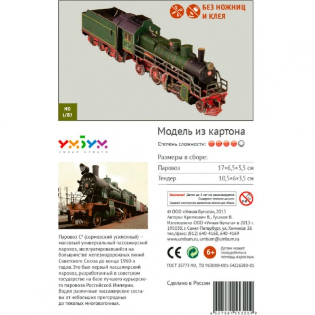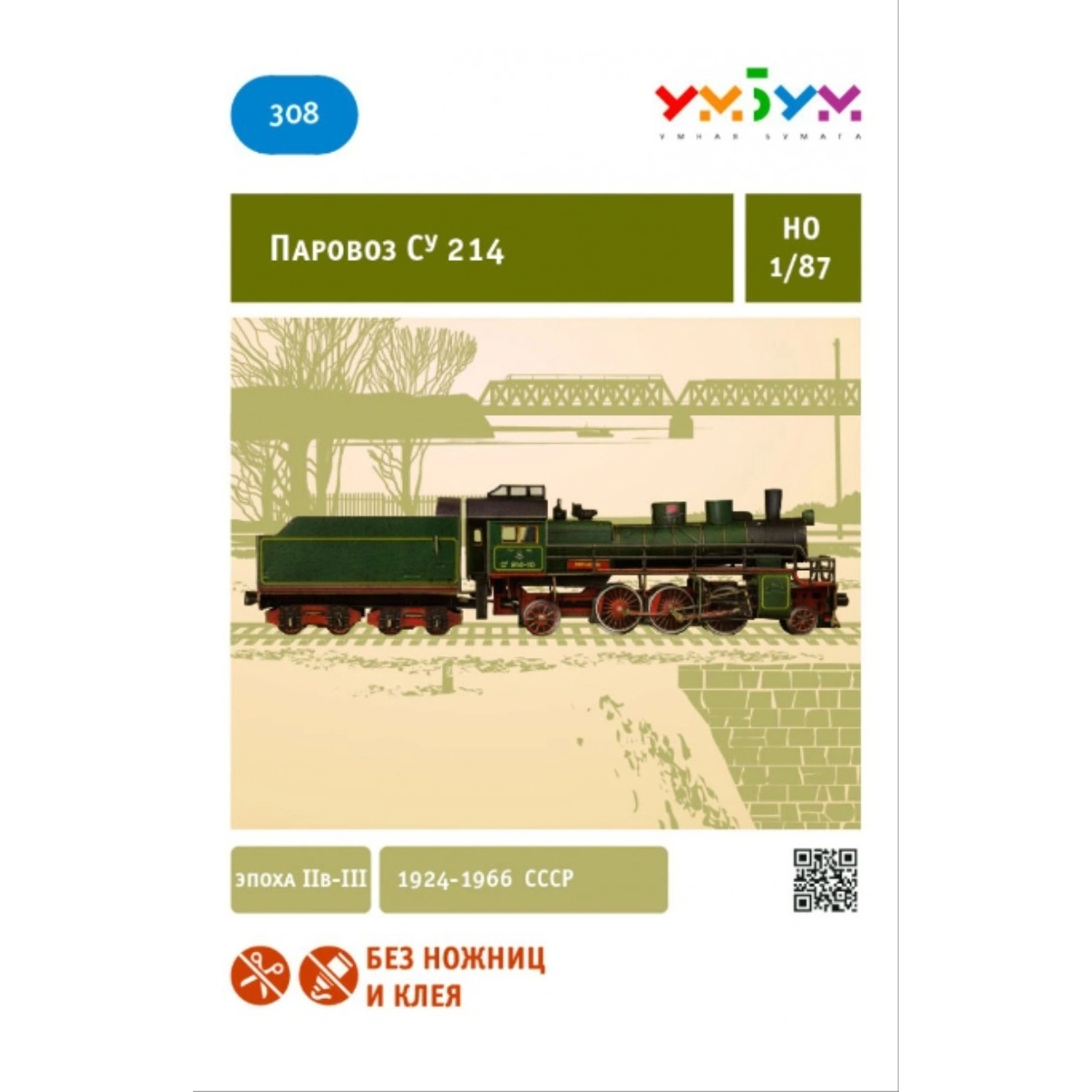 Это сборная модель паровоза из картона в масштабе 1:87, выпущенная брендом УмБум (серия 308). Модель представляет собой элемент железной дороги и предназначена для сборки без использования ножниц и клея — идеальный вариант для любителей моделирования и детей.