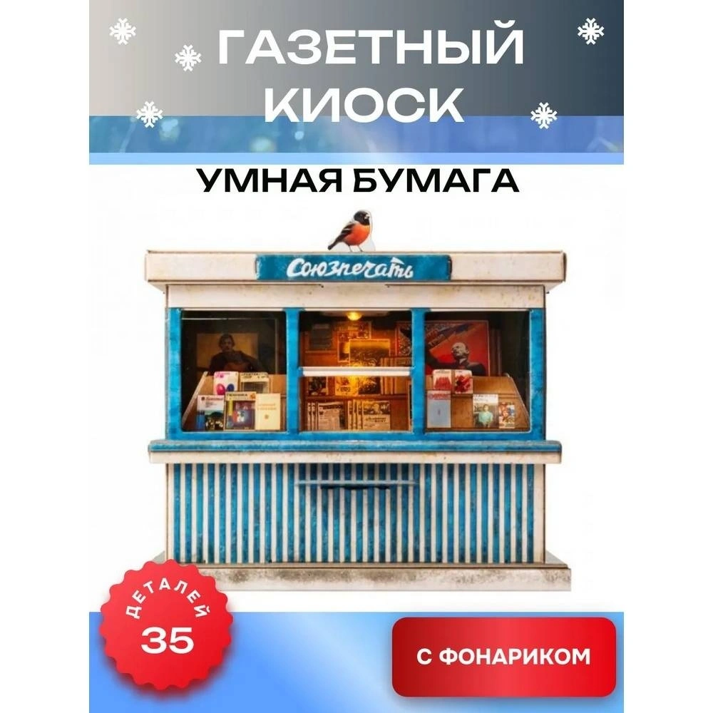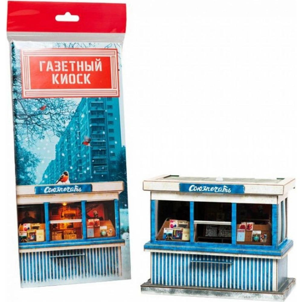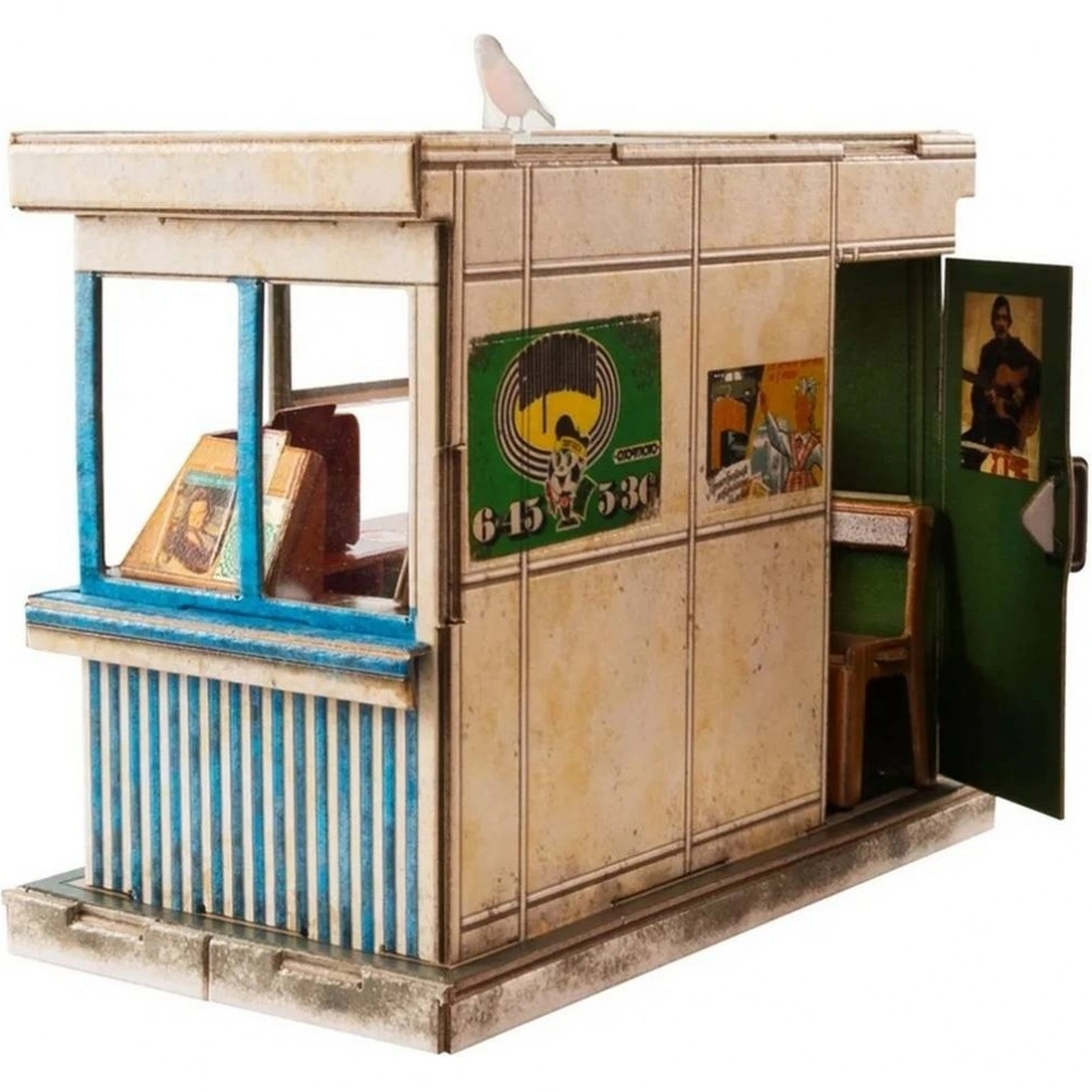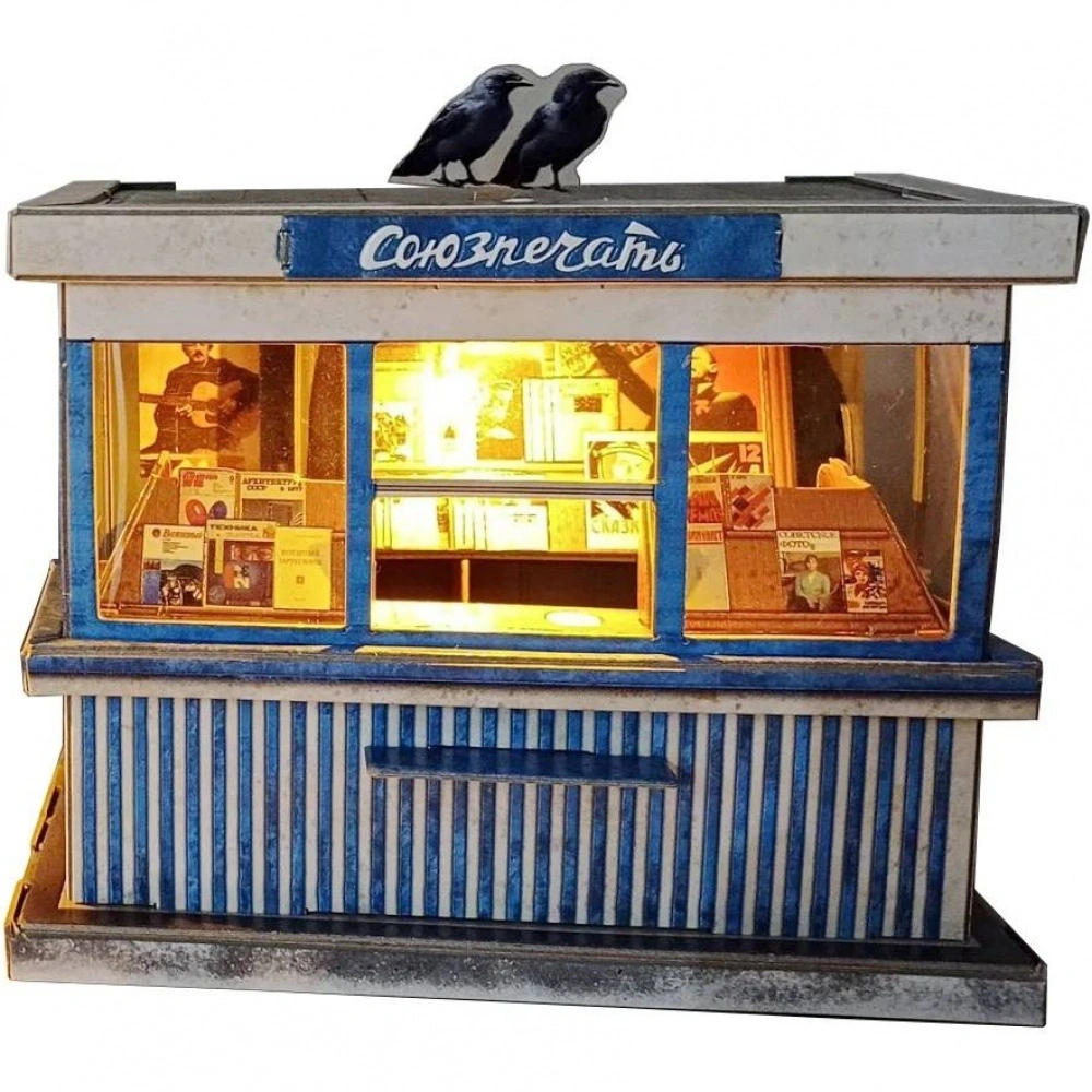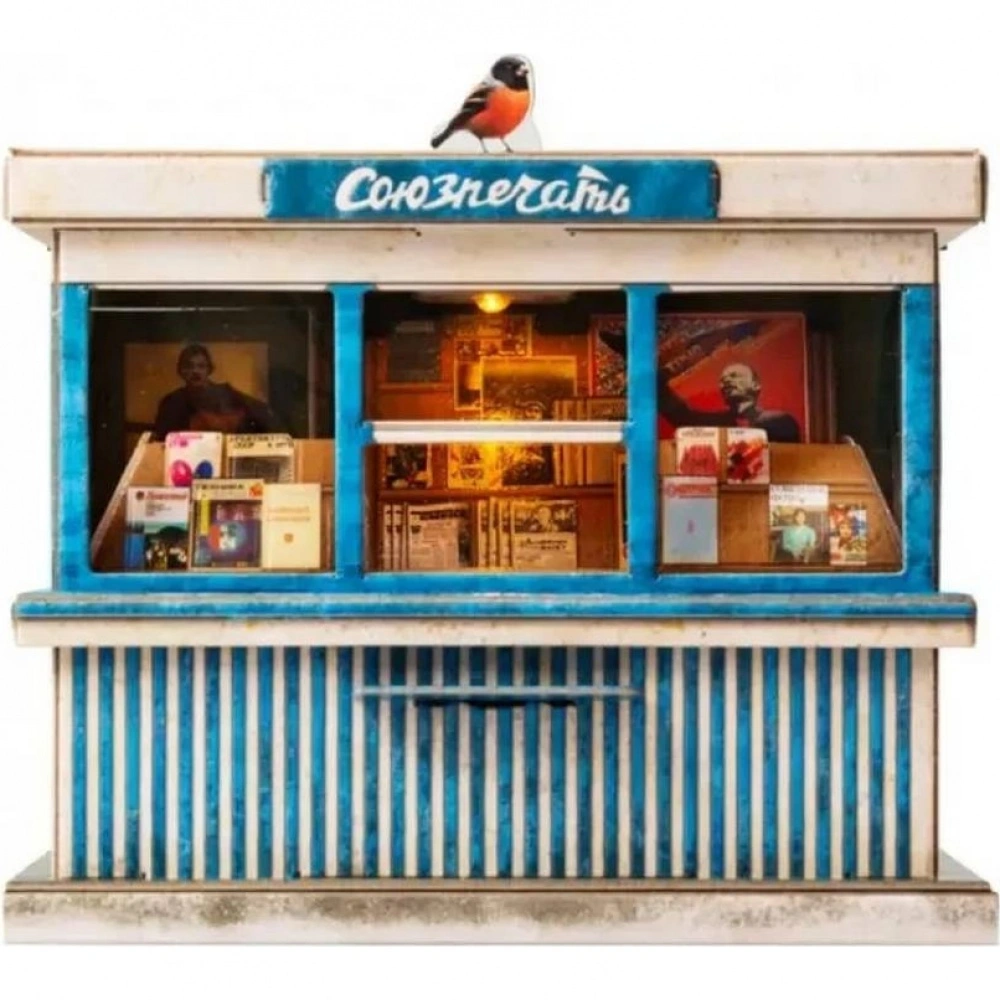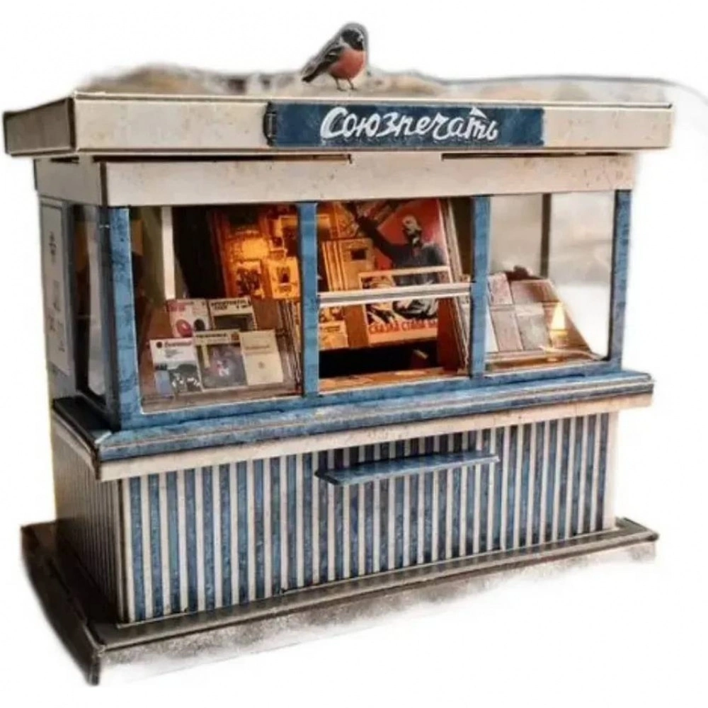 Газетный киоск Союзпечать с фонариком - это детализированная сборная модель, воссоздающая облик газетного киоска времён СССР с фирменным названием «Союзпечать».