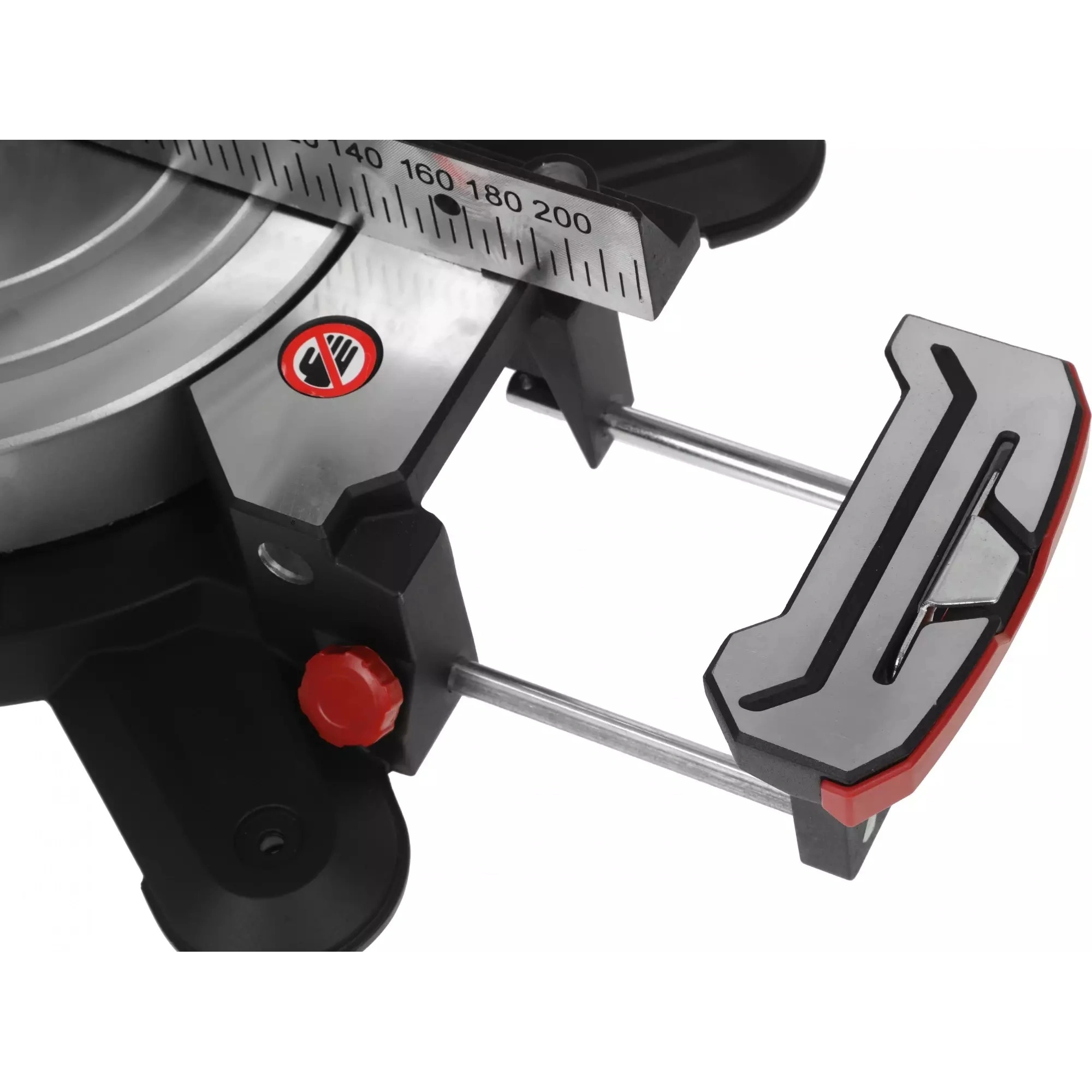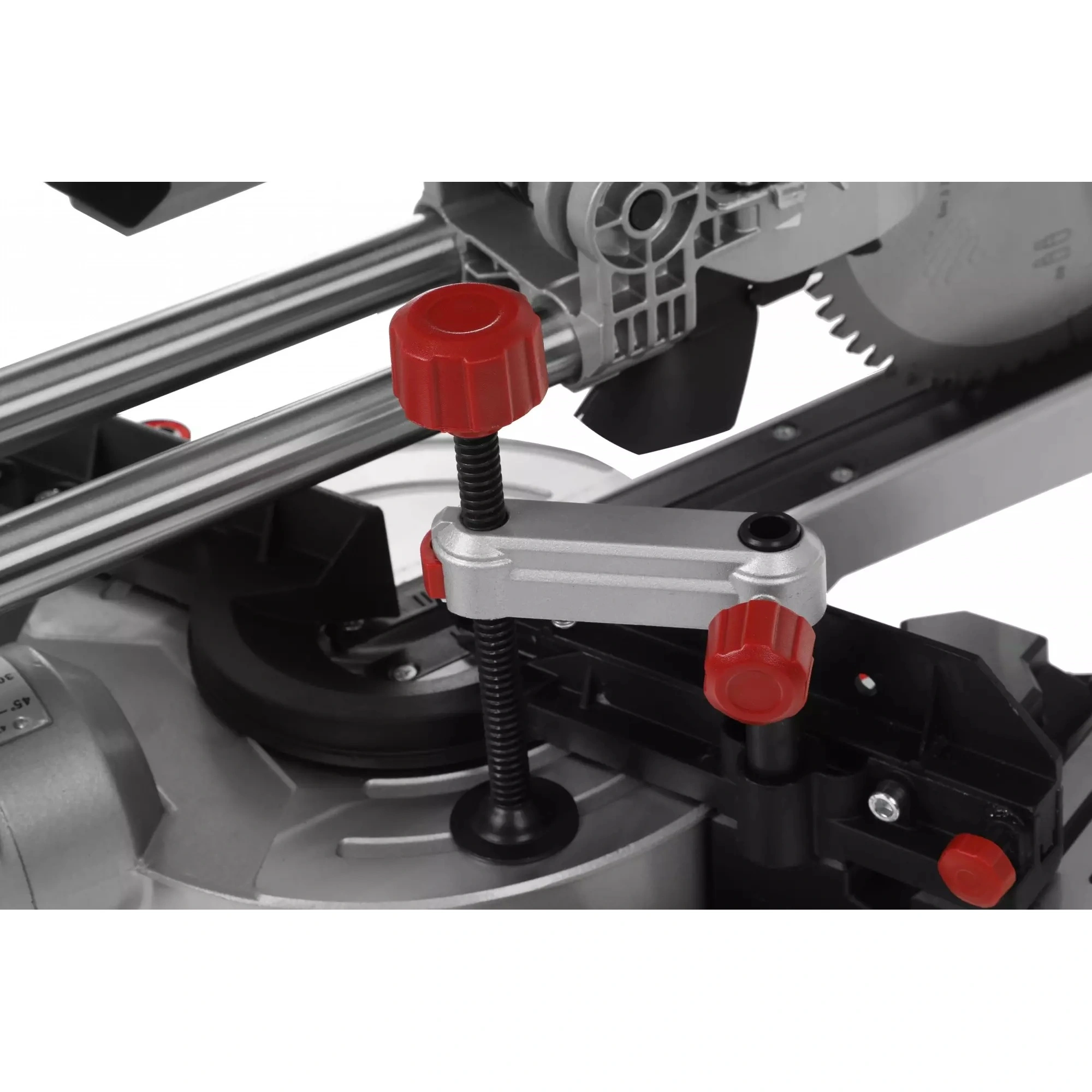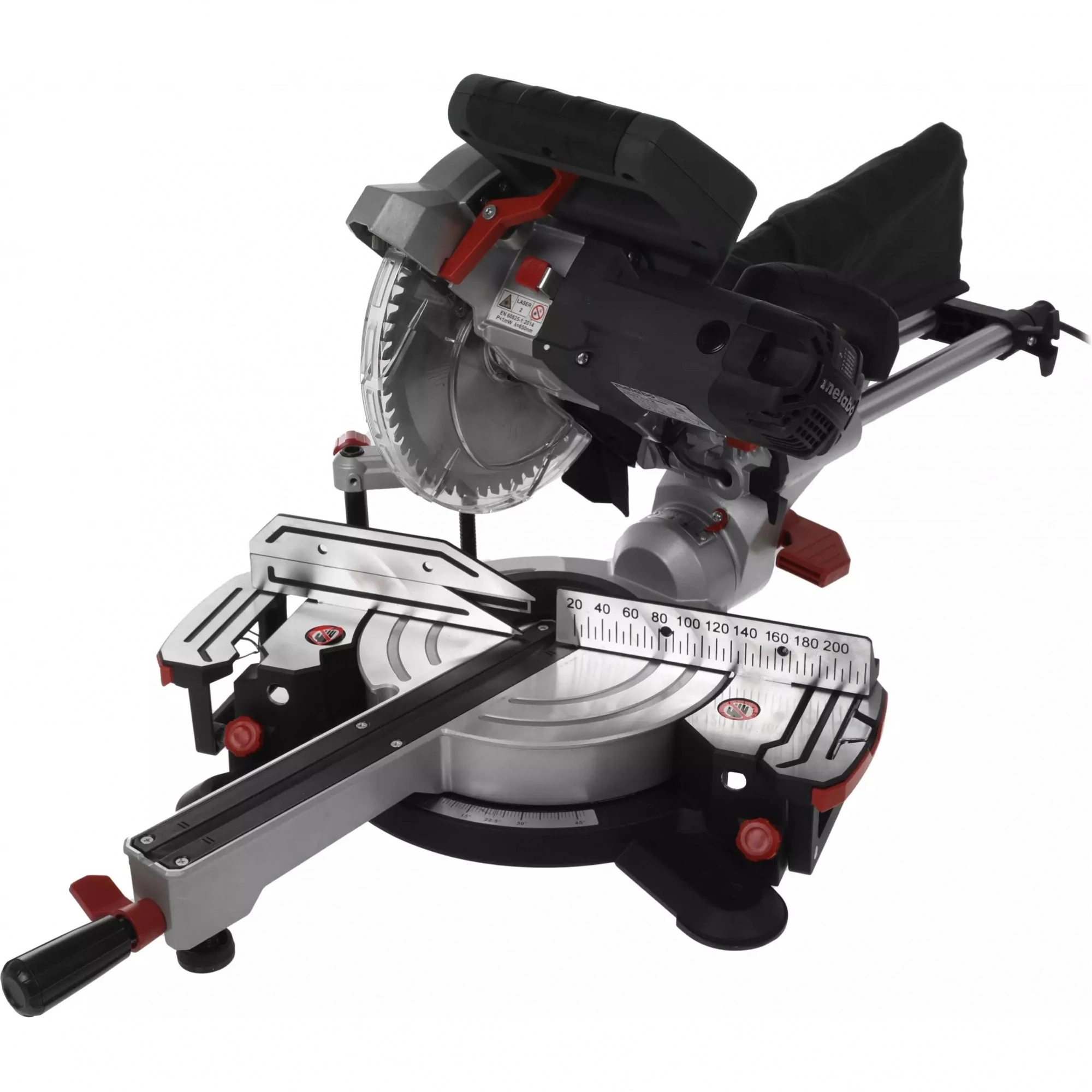 Торцовочная пила, твердосплавное пильное полотно (60 зубьев), 2 встроенных расширения стола, торцовочный упор, зажим для материала, инструмент для смены пильного диска, намотка кабеля, мешок для сбора опилок.