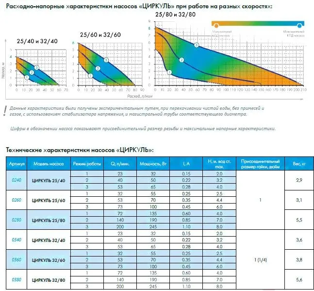 Присоединительный размер гаек — 1? дюйм (32 мм). Максимальный напор достигает 6,2 метров водяного столба, а расход теплоносителя доходит до 62 л/мин.