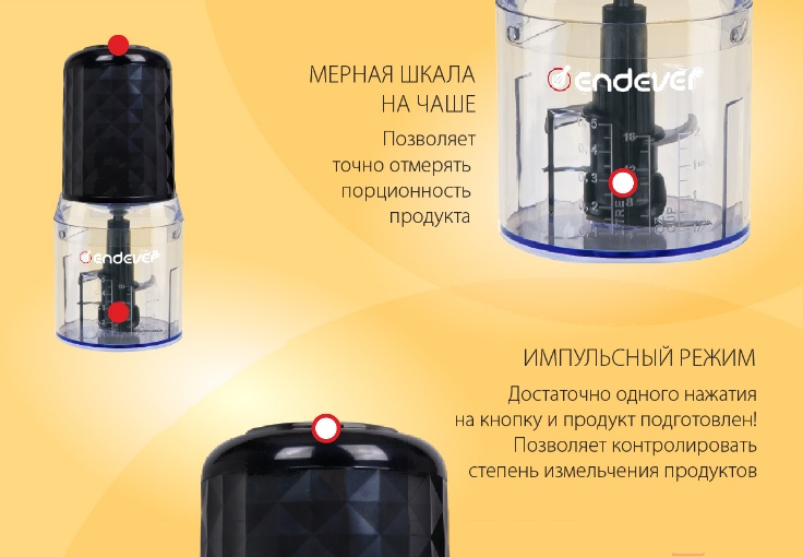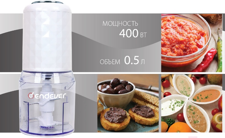 Измельчитель Endever Sigma-59 отличается компактностью. Он подойдет для тех, кто готовит обычно небольшие порции. Прибор позволяет за считанные секунды измельчить овощи, фрукты, ягоды, мясо или рыбу. Для того, чтобы сделать пару котлет и салат к ним еще не придумано ничего удобнее. Endever Sigma-59 легко готовится к работе и разбирается для очистки. Все детали легко вынимаются. В ходе процесса ничего не прольется и не разбрызгается благодаря плотно прилегающей крышке. Двигатель работает на одной скорости, степень измельчения регулируется временем воздействия.