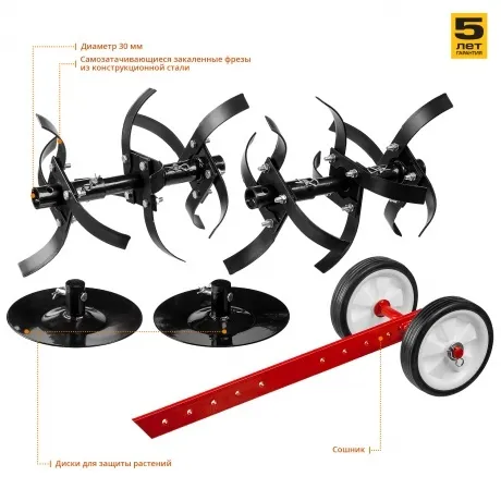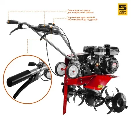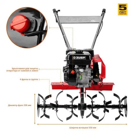 Культиватор Зубр МКТ-200 снабжается бензиновым четырехтактным двигателем мощностью 5100 Вт (7 л.с.), который делает его эффективным при выполнении садово-огородных работ и позволяет применять на участках средней площади. Эта модель обеспечивает рыхление и культивацию почвы на клумбах и грядках за счет насадок-фрез, оснащенных ножами в количестве 6 шт. Она имеет цепную трансмиссию с одной передачей для движения вперед и одной задней передачей, увеличивающей маневренность культиватора при работе близ построек и заборов, в углах участка. При весе 56 кг бензиновый культиватор Зубр МКТ-200 обрабатывает за один проход полосу шириной 850 мм, при этом глубина культивации указана производителем на уровне 330 мм. Двигатель культиватора отличается экономичностью в плане расхода топлива, поэтому полностью заправленного бензобака емкостью 3.6 л ему хватит для продолжительной работы. Боковые диски, комплект крепежа, комплект фрез, набор инструментов, руководство пользователя и сошник поставляются вместе с культиватором.