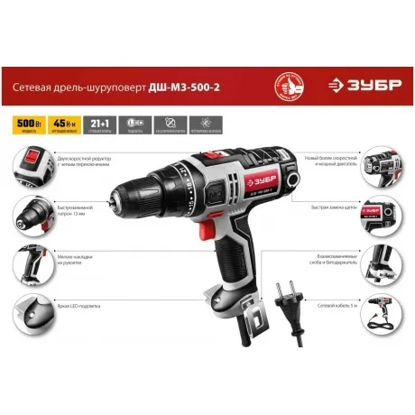 Дрель-шуруповерт сетевая Зубр ДШ-М3-500-2 - купить по цене 3773 руб. в интернет-магазине КотоФото. На карточке товара Вы можете посмотреть подробное описание, характеристики и фото. Заказать товар можно на сайте, добавив в корзину, или позвонить по телефону 8(800)505-43-75 в Тольятти. Доступен самовывоз и доставка.