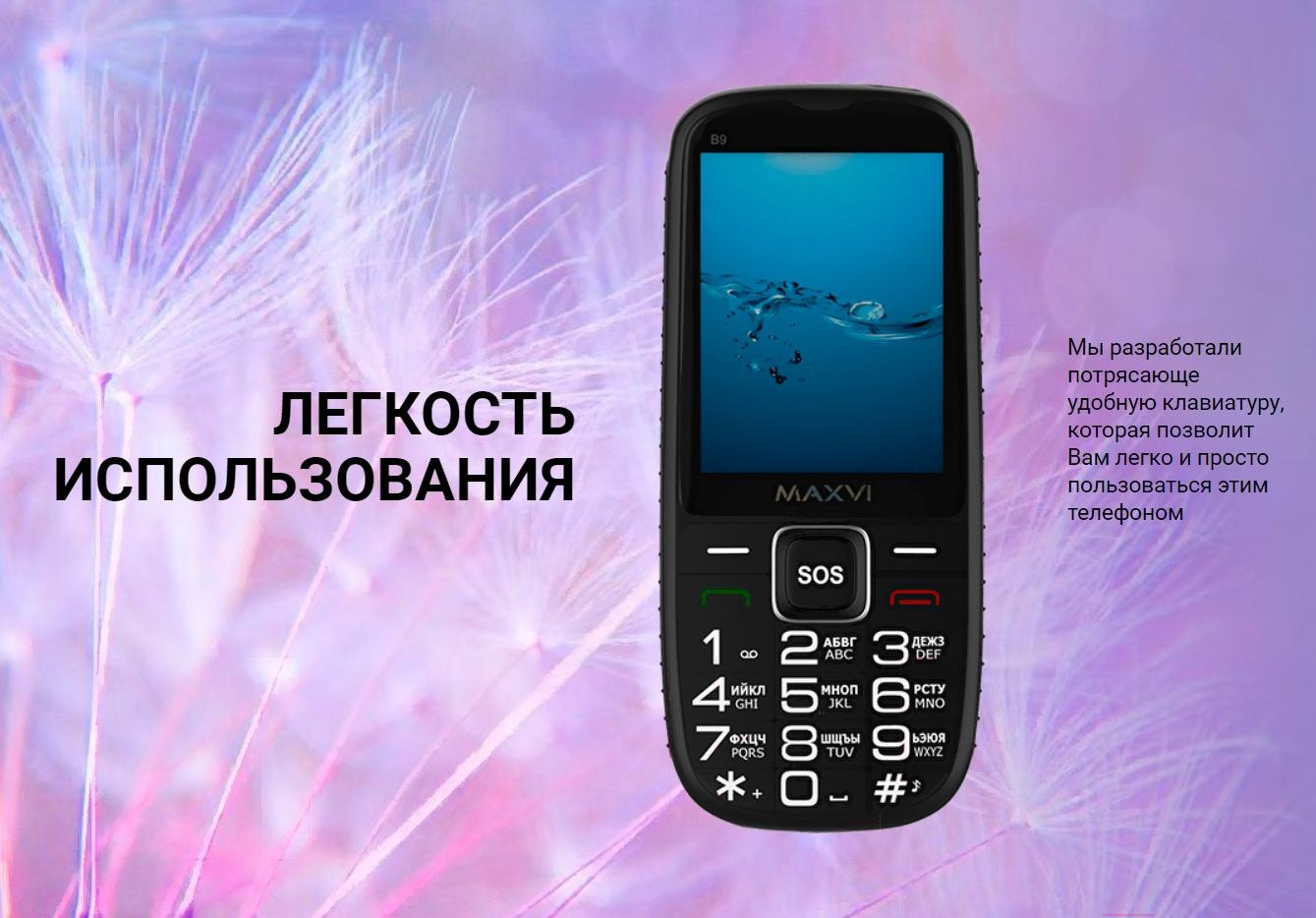Maxvi B9 - телефон, имеющий свою неповторимую индивидуальность. Корпус этого аппарата разработан нами с учетом всего имеющегося опыта, что позволяет назвать Maxvi B9 одним из самых эргономичных девайсов. В дополнение к этому громкий динамик, дисплей с диагональю 2,8’’, камера 0,3Mpx, ёмкая батарея 2000 мАч - сочетание, которое придется Вам по душе!