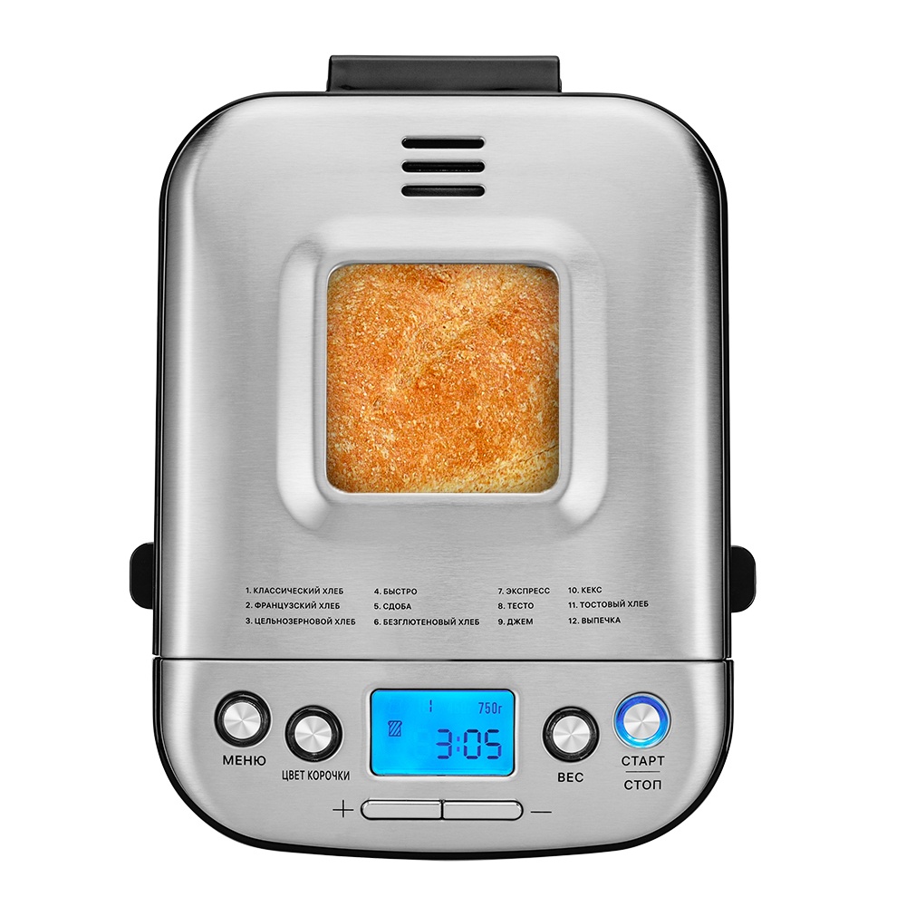 Электрическая хлебопечь KitFort КТ-306 в стильном серебристом корпусе из нержавеющей стали идеально подходит для домашней выпечки разнообразных видов хлеба.Мощность 450 Вт гарантирует равномерный и качественный процесс приготовления и помогает экономить электроэнергию.Встроенный таймер с отсрочкой старта до 13 часов позволяет запланировать выпечку к нужному времени без дополнительного контроля.Двенадцать программ приготовления охватывают широкий спектр рецептов, включая безглютеновый хлеб, варенье, кексы и французский хлеб.Форма с антипригарным покрытием облегчает извлечение готового изделия и упрощает уход за прибором.Регулировка веса выпечки до 750 граммов дает возможность готовить как маленькие, так и большие буханки по вашему желанию.Функция выбора цвета корочки помогает получить хлеб с золотистой или более темной корочкой в зависимости от предпочтений.Дисплей и окно для контроля процесса позволяют следить за стадиями выпечки без открытия крышки.Запоминание программы и сохранение данных при сбое питания обеспечивают надежность и удобство использования.