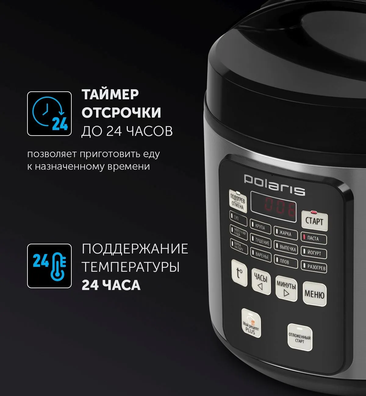 Мультиварка Polaris PMC 0593AD создана для тех, кто ценит своё время и хочет готовить еду быстро и просто. С функцией «Отложенный старт» можно установить таймер до начала приготовления блюда в течение 24 часов. Мультиварка с антипригарной чашей на 5 литров имеет 48 автоматических программ приготовления, которые обеспечат и разнообразие блюд. В памяти мультиварки программы: мой рецепт plus, суп, крупа, жарка, паста, молочная каша, тушение, выпечка, йогурт, варка на пару, варенье, плов, разогрев и другие программы.