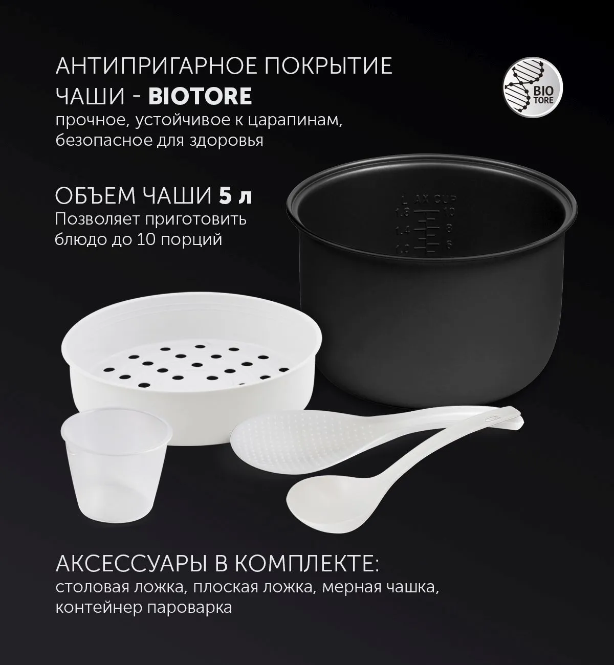Таймер отсрочки до 24 часов позволяет приготовить еду к назначенному времени. Сохранение программы при сбое электропитания - 20 минут. Объем чаши 5 л позволяет приготовить блюдо до 10 порций. Съемный шнур. Аксессуары: столовая ложка, плоская ложка, мерная чашка, контейнер пароварка.