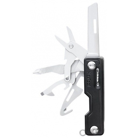 NexTool Multifunction Knife Black (NE20096) – складной многофункциональный нож 10 в 1. Вес составляет всего 88 грамм, а размеры настолько малы, что его можно использовать как брелок для ключей, а так же этот мультитул незаменимая вещь в повседневной жизни, в походе, на охоте или рыбалке. Корпус состоит из прочного, матового ABS пластика, который обволакивает высокопрочную сталь марки 20Cr13 (корпус) и 30Cr13 (нож). Марка стали 30Cr13 (производство Германия) нержавеющая (коррозионно-стойкая). Ножи этой марки стали износостойки, легко переносят удары и не будут раскалываться при пользовании. Перечень функционала: нож (длина лезвия 5 см), аварийный молоток для разбивания стекла, открывалка консервных банок, стропорез (разрежет ремень, веревку, шнурки), ножницы, держатель для телефона (вертикальный и горизонтальный), ключ для извлечения сим-карты, напильник, открывалка для бутылок, отвертка.