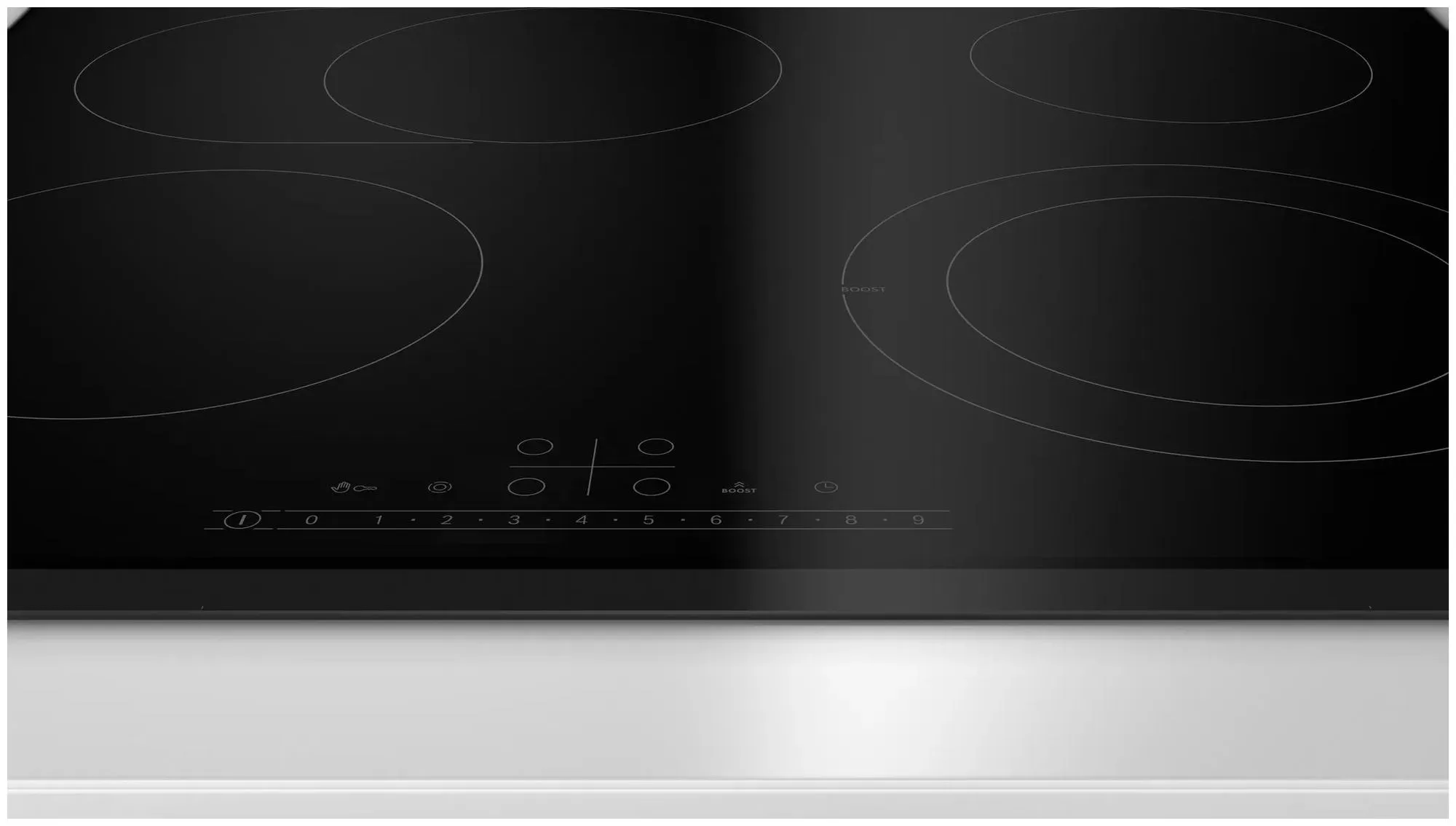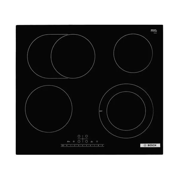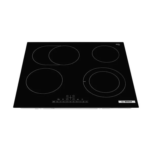 Электрическая варочная поверхность Bosch PKN651FP2E выполнена из стеклокерамики и содержит скошенные углы рамки. Это обеспечивает бережную эксплуатацию устройства. Панель общей мощностью 8.3 кВт содержит четыре варочных зоны с возможностью регулировки мощности каждой из них. Предусмотрено 17 ступеней мощности, для выбора которых достаточно одного касания. На стекле отпечатаны индикаторы панели управления. Особенность Bosch PKN651FP2E в наличии зоны расширения, что позволяет устанавливать на поверхность широкую посуду, такую, как жаровни. Функция «PowerBoost» позволяет добавить энергию конфорке, чтобы ускорить процесс готовки. Эта функция будет актуальна, когда необходимо быстро вскипятить воду. Благодаря функции «ReStart» устройство сохраняет предыдущие настройки, если прибор был случайно отключен. При включении в течение 4 секунд панели все настройки восстанавливаются. Для удобства готовки также предусмотрен таймер с выключением. Достаточно задать время приготовления, и таймер отключит конфорку по истечении времени. Безопасная эксплуатация обусловлена использованием специальной функции «Блокировка от детей».