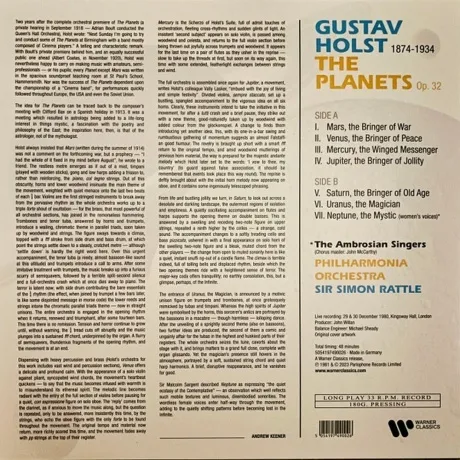 Виниловая пластинка Holst The Planets Simon Rattle Philharmonia Orchestra, The Ambrosian Singers - перевыпуск концертной записи культового произведения Густава Холста в исполнении Филармонического оркестра под управлением сэра Симона Раттла. Исполнитель Simon Rattle Жанры Classical