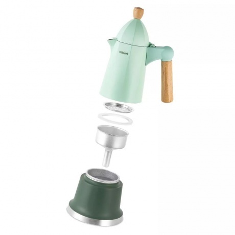 Гейзерная кофеварка КТ-7154 поможет приготовить вам ароматный чёрный кофе. Она компактная и простая в использовании. Кофеварка идеально подойдёт для приготовления кофе в домашних условиях или на даче. В резервуар наливают воду и устанавливают воронку с фильтром, куда добавляют молотый кофе. Сверху накручивается резервуар для кофе. Далее кофеварку помещают на плиту. Вода нагревается, пар вытесняет горячую воду через фильтр и получается готовый кофе!. С гейзерной кофеваркой нет необходимости следить за поднятием пенки, а получаемый кофе не содержит гущи. КТ-7154 рассчитана на приготовление 6 чашек кофе по 40 мл. В воронку с фильтром помещается 25 г. кофе, а резервуар для воды составляет 350 мл. Гейзерная кофеварка КТ-7154 подходит для использования на газовых, электрических и инфракрасных плитах. Рекомендуется включать плиту на среднюю мощность при заваривании кофе. Дождитесь, когда кофеварка остынет, и разберите её на составные части. Для этого открутите резервуар для кофе от резервуара для воды. Вытащите воронку с фильтром и вытряхните кофейный жмых. Промывайте все детали тёплой проточной водой. Кофеварка порадует вас не только свежеприготовленным ароматным кофе, но и своим креативным дизайном! Эргономичная деревянная ручка не скользит в руке и позволяет брать устройство, не рискуя обжечься.