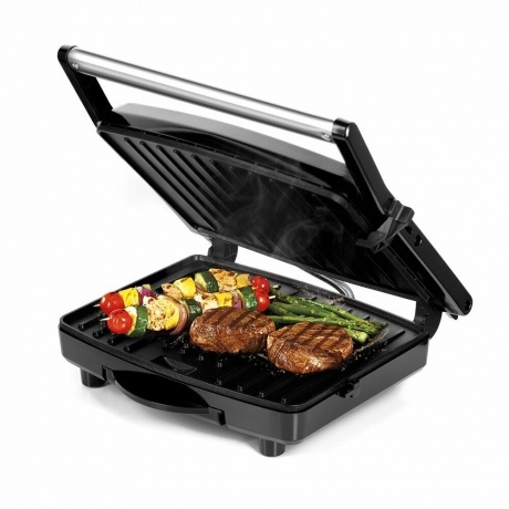 Электрогриль КТ-3613 предназначен для приготовления мяса, рыбы, овощей, сосисок, бутербродов, панини, сэндвичей, гренок, тостов и многих других блюд. Высокая температура панели способствует быстрому приготовлению продуктов. Гриль оснащён термостатом для поддержания температуры панелей, а также индикаторами работы и нагрева. С помощью регулятора вы сможете плавно менять температуру приготовления. Минимальная температура соответствует первому делению, максимальная – 4. Конструкция электрогриля предусматривает приготовление продуктов с закрытой крышкой. При таком приготовлении продукты находятся между двух панелей и готовятся равномерно с двух сторон. В процессе приготовления продуктов образуются жир и сок, которые стекают в поддон для сбора жира. Просто выньте поддон и помойте его с моющим средством. Ваша кухня останется чистой! Антипригарное покрытие позволяет готовить с минимальным количеством масла или без него. Лопатка для очистки панелей из комплекта поможет вам легко удалить остатки масла и жира с панелей после приготовления.