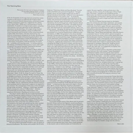 Альбом Saudades бразильской перкуссионистки Наны Васконселос записанный в марте 1979 года, стал кульминацией мечты музыканта, который давно мечтал услышать беримбау в оркестровом контексте. Этот «концерт» для новаторского исполнителя на традиционном инструменте стал возможен благодаря творческому вкладу Эгберто Гисмонти, аранжировщика материала для струнных, а также соавтора и солиста второго плана. Симфоническим оркестром радио Штутгарта дирижировал Младен Гутеша (который ранее работал с ECM над трансидиоматическими проектами с Китом Джарреттом, Яном Гарбареком и Терье Рипдалом). Продюсированный Манфредом Эйхером, Saudades остается необыкновенным путешествием, опережающим свое время альбомом, ожидающим, пока мир его догонит. В это виниловое переиздание в разворотном конверте добавлены новые примечания, содержащие исторический контекст и справочную информацию.