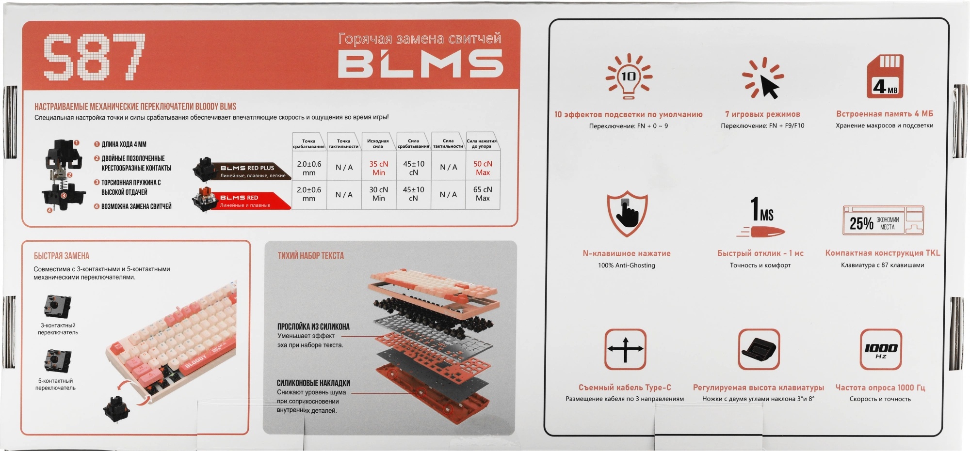 Клавиатура A4TECH — идеальный выбор для геймеров и любителей стильных устройств. Этот механический TKL (80%) девайс выполнен в элегантном розовом цвете и оснащен 88 клавишами, что придаёт ему компактность, сохраняя при этом все необходимые функциональные возможности. Клавиатура имеет ANSI раскладку и поддерживает Hot Swap, позволяя легко менять переключатели без пайки, что особенно удобно для создания уникального тактильного ощущения.