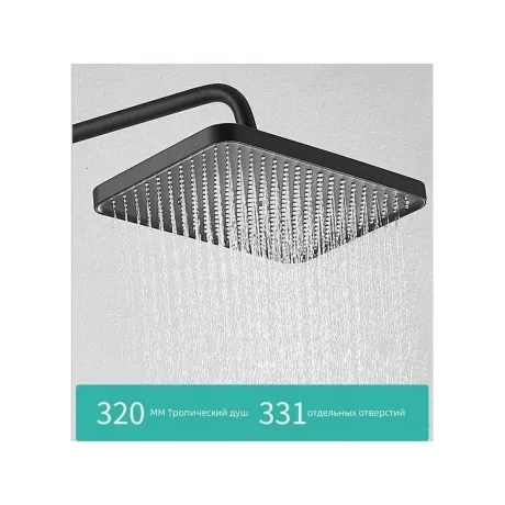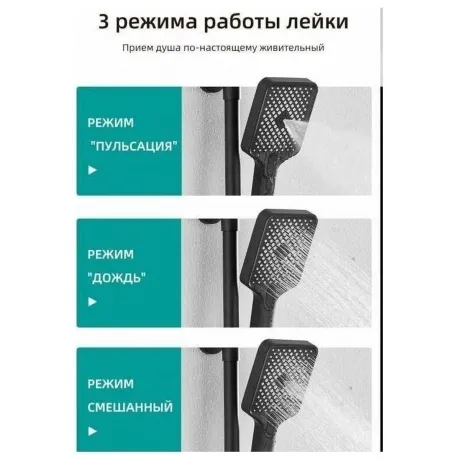 Регулируемая лейка верхнего и ручного душа по высоте и углу наклона. 3 режима работы душевой лейки: пульсация, дождь и смешанный. Скрытый излив под полочкой (экономия пространства)