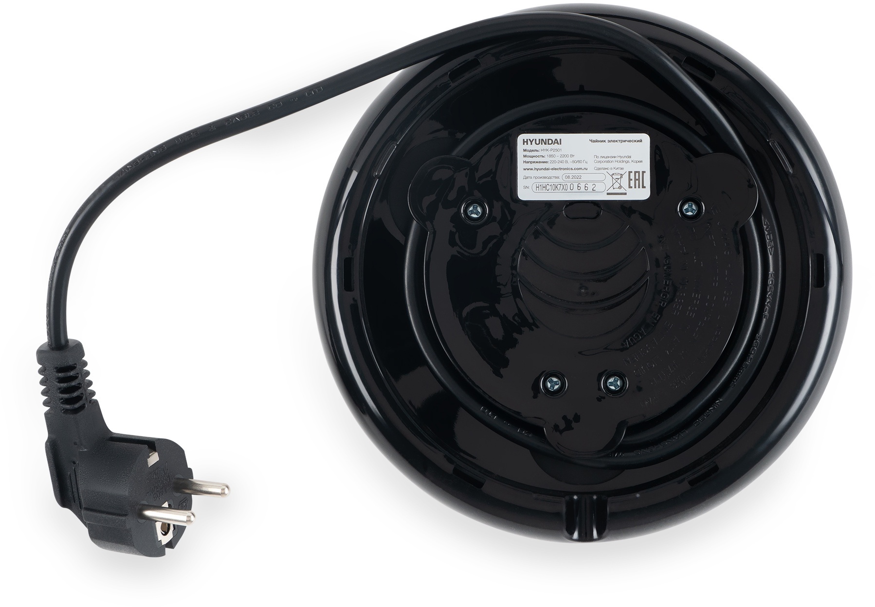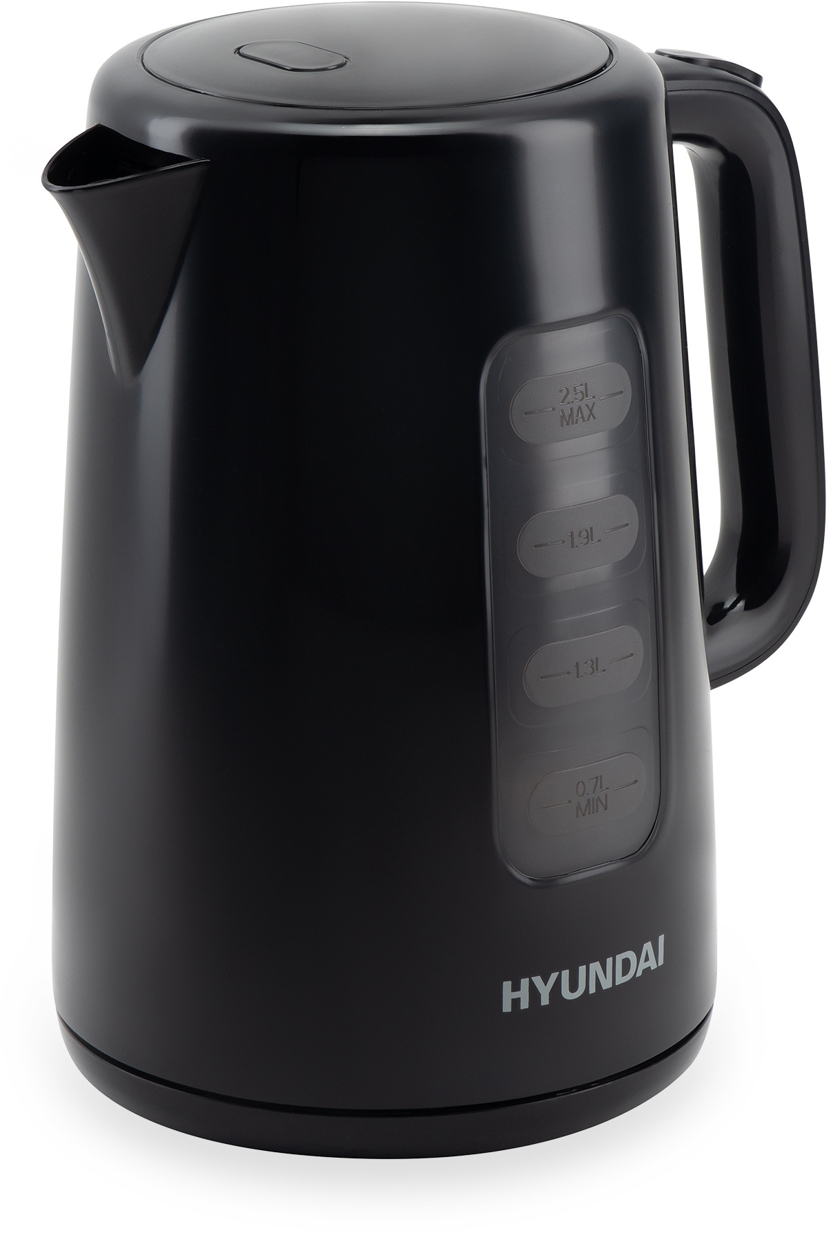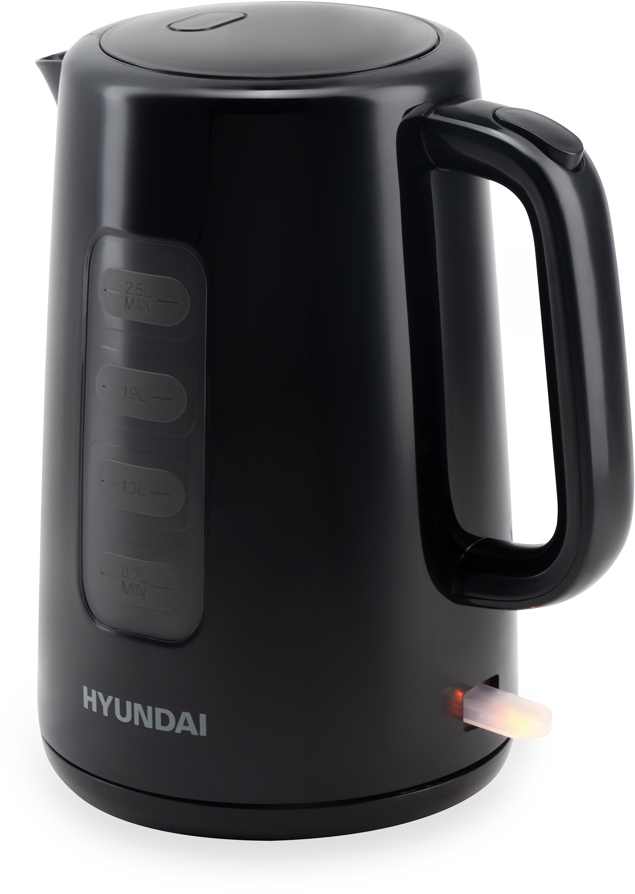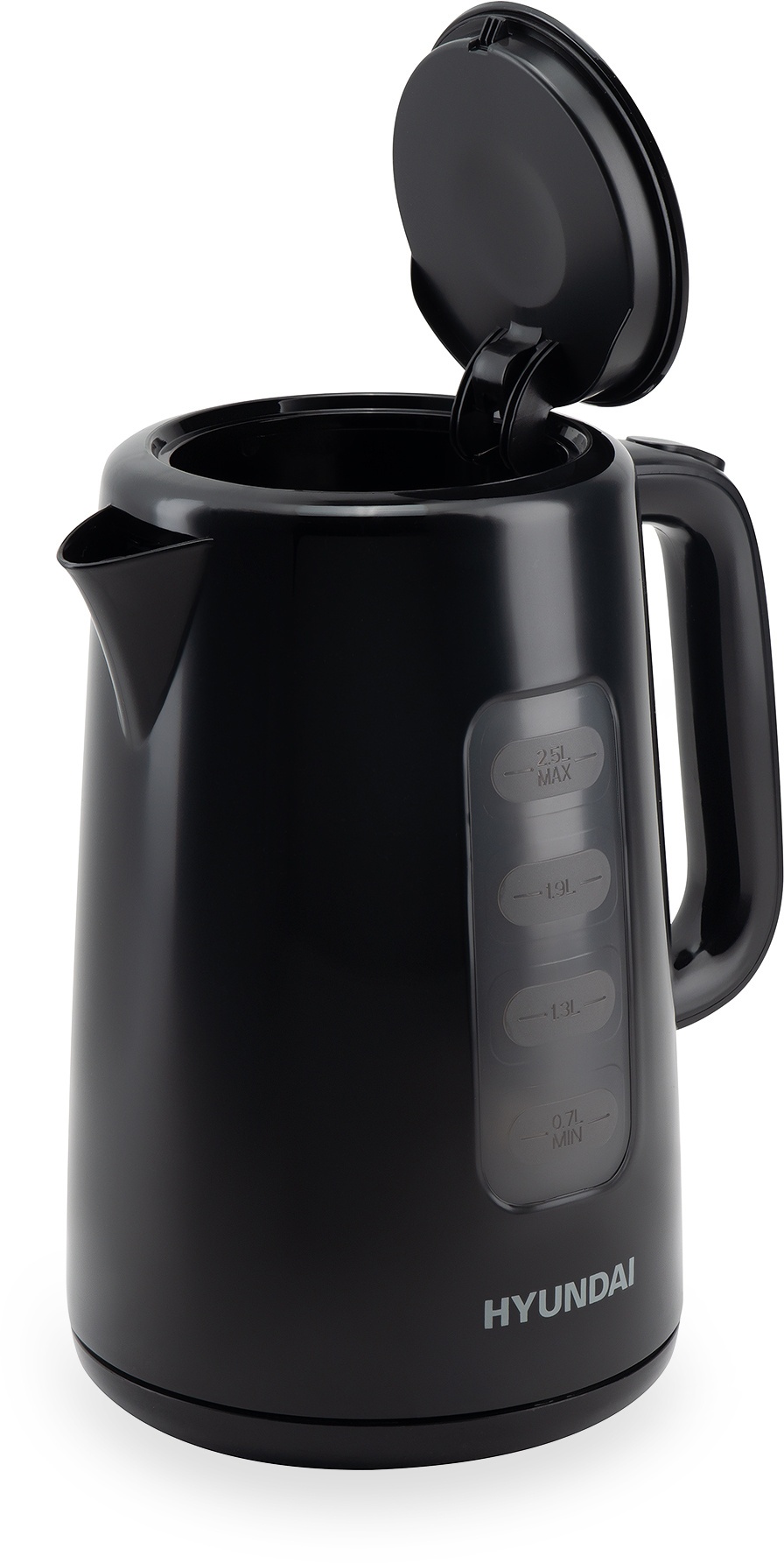 Hyundai HYK-P2501 – это эргономичный электрический чайник с рядом преимуществ. Первое из них – внушительный внутренний объём, рассчитанный на 2.5 л воды. Чтобы нагреть полную ёмкость до состояния кипятка, прибору требуются считанные моменты. Это возможно благодаря предусмотренной мощности в 2200 Вт и высокотехнологичному скрытому в подставке нагревательному элементу. На ней чайник Hyundai HYK-P2501 проворачивается на 360 градусов. Корпус данной модели изготовлен из качественного и прочного и лёгкого пластика. Он помогает не обжигать руки и сохранять температуру в течение долгого времени. Дизайн прибора выполнен в минималистичном чёрном цвете с использованием полупрозрачных деталей. На стенке чайника расположен индикатор уровня наполненности. Под рукояткой устройства находится световой индикатор, который показывает, когда Hyundai HYK-P2501 работает. После окончания цикла нагрева устройство автоматически выключается. Кроме того, прибор надежно защищен от пуска без воды. Эта мера продлевает ресурс работы нагревательного элемента. Крышка чайника закрывается на защёлку и открывается по нажатию кнопки.