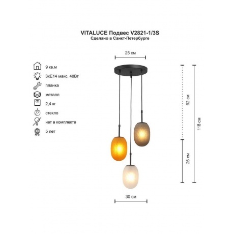 подвесной светильник vitaluce v2821-1/3s с тремя лампами e14 максимальной мощностью 40 вт выполнен в стиле модерн с металлическим черным каркасом и стеклянными плафонами, подходит для зала, обеспечивает освещение площадью около 9 кв.м, степень защиты ip20, гарантия 5 лет
