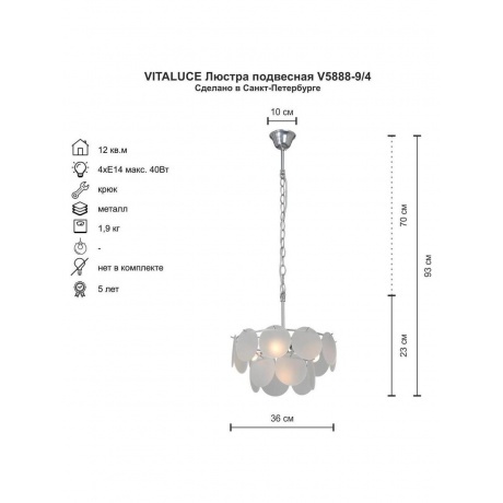 подвесная люстра vitaluce v5888-9/4 с четырьмя лампами e14 мощностью до 40 вт каждая, высота 23 см, диаметр 36 см, подходит для создания уютного освещения в интерьере.