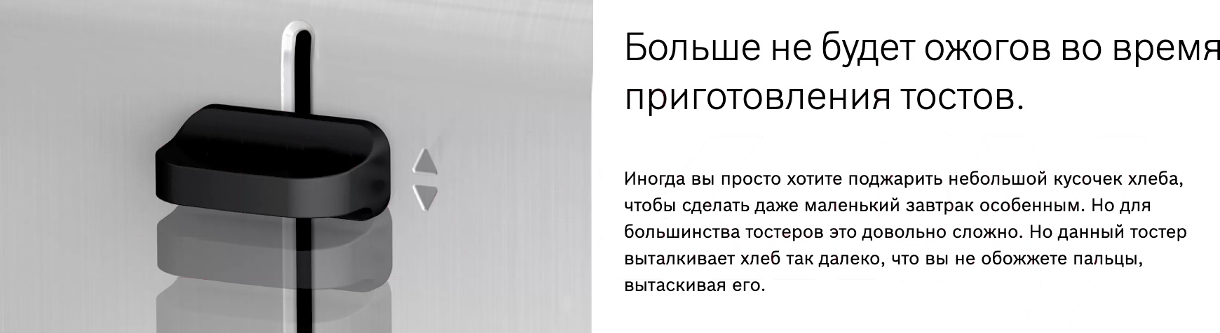 Особенностью модели является автоматический выброс тостов и автоматическое центрирование хлеба, что обеспечивает равномерное прожаривание с обеих сторон. Также предусмотрена функция экстра подъема маленьких ломтиков хлеба, что делает использование тостера еще более удобным и безопасным.