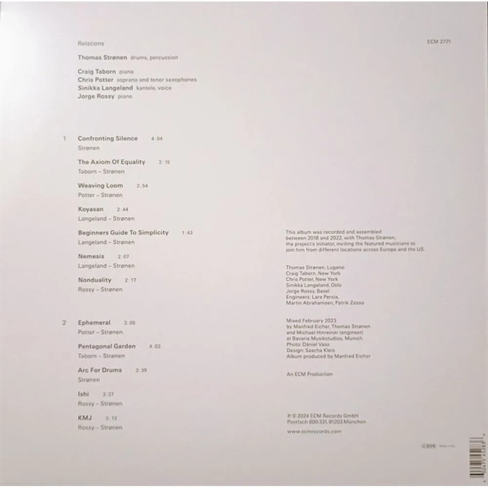 На альбоме Relations норвежский барабанщик и композитор Томас Стрёнен представляет убедительное сольное выступление, исследующее пересечение ритма, резонанса и тишины. Используя минималистичную акустическую установку — в основном барабаны и настроенную перкуссию — Стрёнен создаёт атмосферный звуковой ландшафт, богатый деталями и нюансами. Медитативный темп и сложные фактуры альбома отражают эстетику пространства ECM, одновременно подчёркивая изобретательное использование Стрёненом тембра и пространства. Записанный в студии Rainbow в Осло, этот сольный альбом ещё раз подтверждает его уникальный голос в современной импровизационной музыке.
