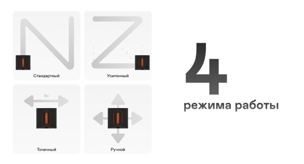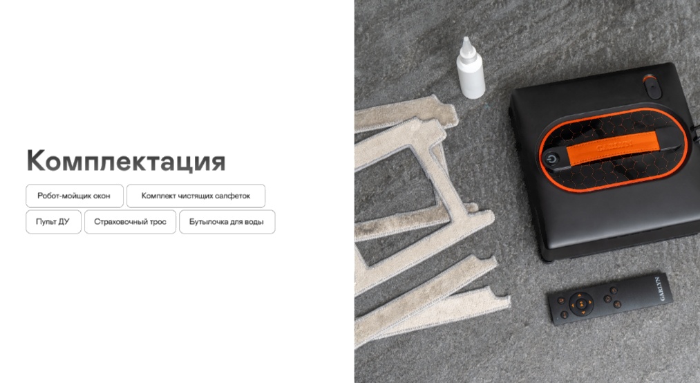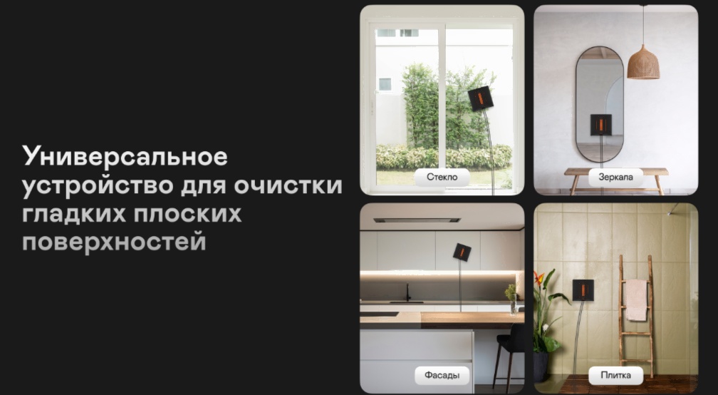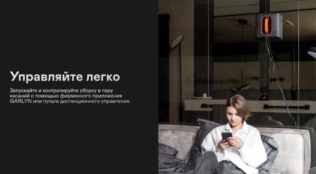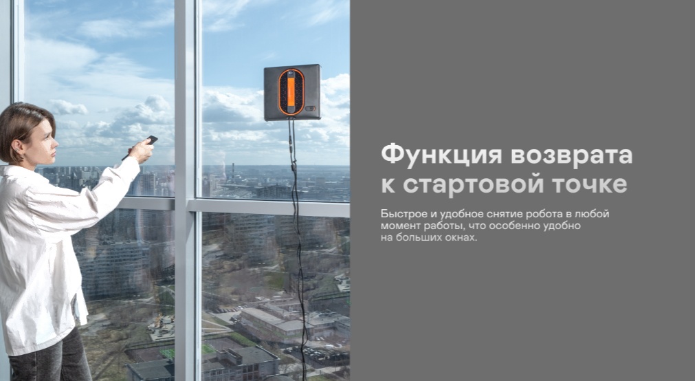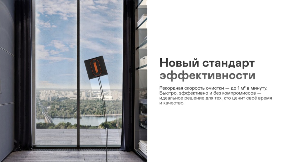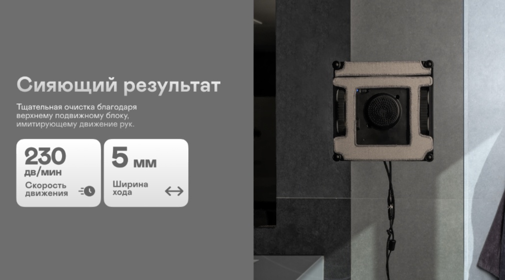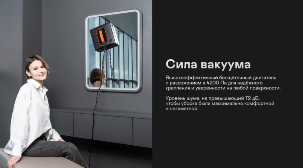 Мощный BLDC-двигатель с разрежением 4200 Па и система автоподачи воды. Имитация ручного мытья, безопасная работа даже на безрамочном остеклении, управление со смартфона, пульта и голосовой помощник.
