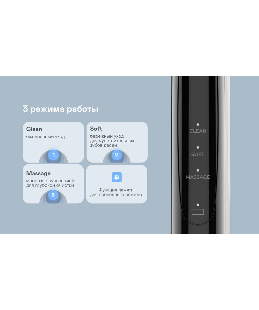 Электрическая щётка обеспечивает эффективную гигиену полости рта благодаря мощным вращательным движениям и продуманным режимам работы. Таймер с напоминанием о смене зоны чистки, функция памяти и автоотключение делают процесс максимально удобным и безопасным. Компактный корпус с влагозащитой позволяет использовать устройство без ограничений, а ёмкий аккумулятор обеспечивает длительную автономность даже при регулярном применении.