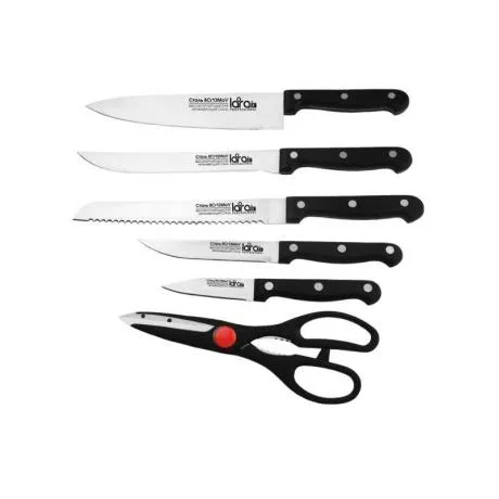 В данный набор входят 5 ножей, ножницы и подставка из сосны. Высококачественная нержавеющая сталь и острая режущая кромка.