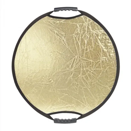 Односторонний круглый отражатель, золотистые и серебристые полоски. Диаметр 56 см, используется в предметной и портретной съемке, а также для подсветки отдельных участков кадра. Золотисто-серебристые полоски модифицируют световой поток от источника в эффективный умеренно теплый и мягкий световой поток, перенаправляемый на объект съемки. Стальной упругий каркас прошит по периметру капроновым карманом, диаметр отражателя в сложенном виде – 20 см. Две рукоятки, закрепленные на каркасе, оборудованы отверстиями с резьбой 1/4, что позволяет закрепить отражатель на штативах, стойках или любых других опорах, без использования специального держателя.