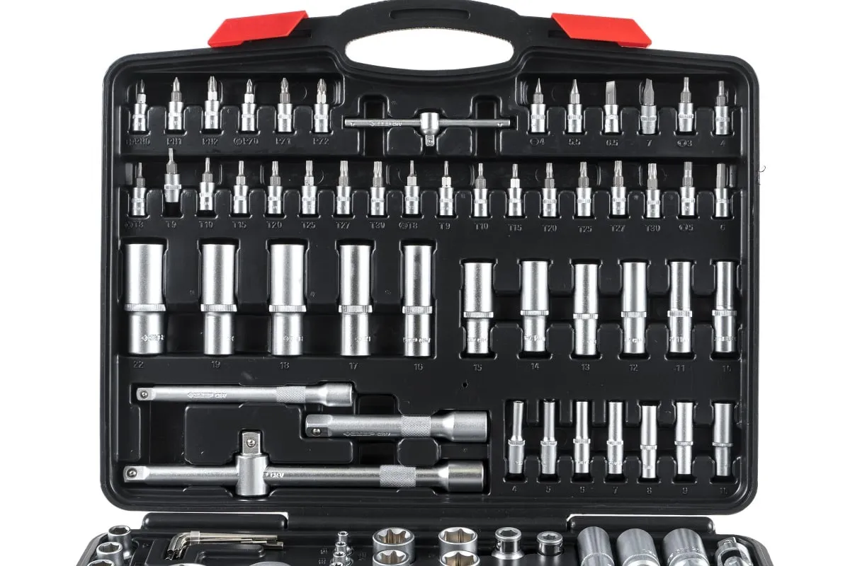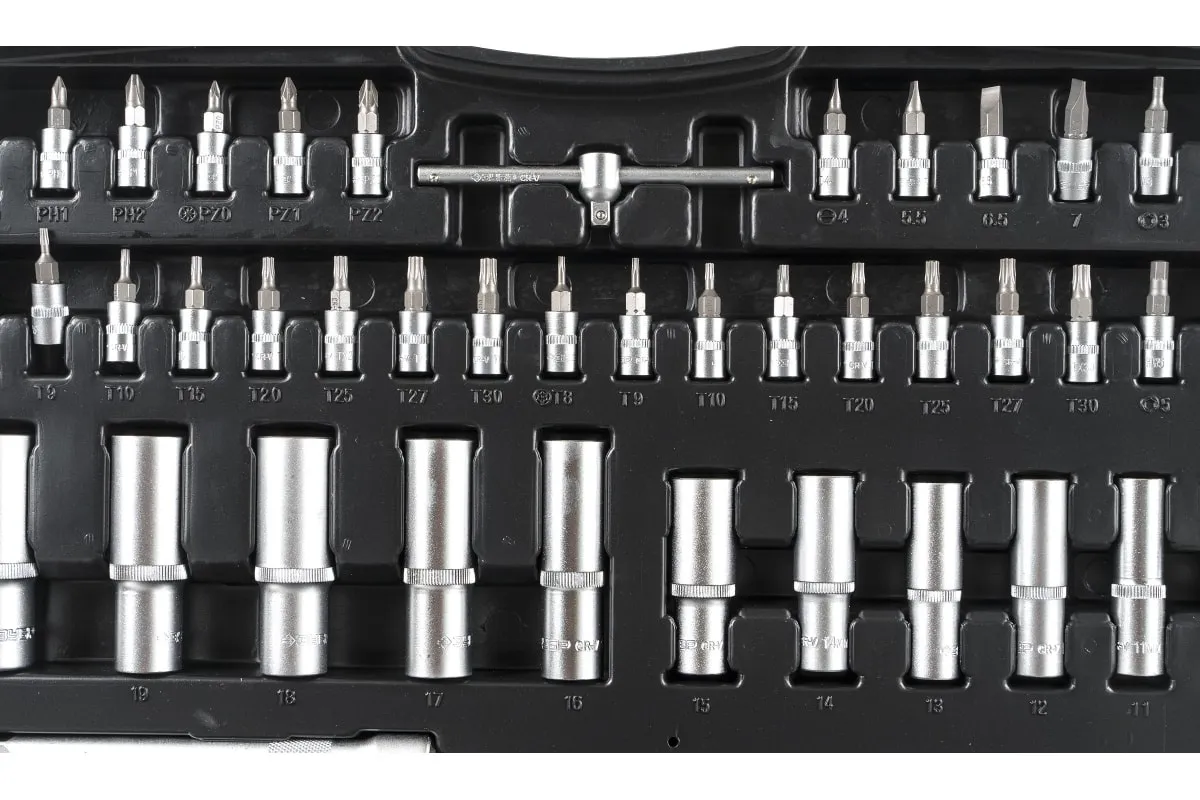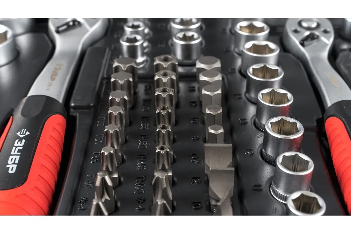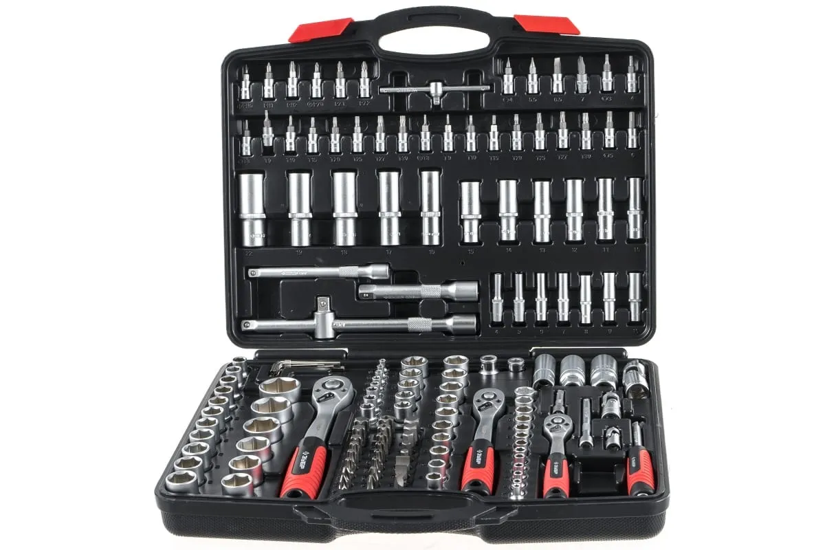 Свечные FLANK с резиновой вставкой 1/2 2 шт. — 16, 21 мм. Головка торцовая свечная 3/8 FLANK с резиновой вставкой — 18 мм. Головки торцовые 1/2 E-TORX 2 шт. — Е20, Е24. Головки торцовые 3/8 E-TORX 6 шт. — Е10, Е11, Е12, Е14, Е16, Е18. Головки торцовые 1/4 E-TORX 5 шт. — Е4, Е5, Е6, Е7, Е8. Трещотка с быстрым сбросом 72 зубца 3 шт. — 1/2, 3/8, 1/4 — 72 зубца. Удлинители 1/2 2 шт. — 125, 250 мм. Удлинитель 3/8 1 шт. — 150 мм. Удлинители 1/4 2 шт. — 50, 100 мм. Шарнир карданный 3 шт. — 1/2, 3/8, 1/4. Адаптер трехпозиционный — 3/8M x 1/2F. Вороток-отвертка 1/4 — 150 мм. Т-образный вороток 1/4 — 115 мм. Адаптер для бит 2 шт. — 1/2F x 5/16M, 3/8F x 5/16M. Биты — 5/16 х 30 мм 24 шт. TORX — T40, T45, T50, T55, T60, T70. TORX HOLE — TH40, TH50, TH55, TH60, TH70. PHILIPS 2 шт. — PH3, PH4. POZIDRIVE — PZ3, PZ4. SLOT — SL8, SL10, SL12. HEX — H7, H8, H10, H12, H14. Биты-головки — 1/4 х 35 мм 30 шт. TORX — T8, T9, T10, T15, T20, T25, T27, T30. TORX HOLE TH8, TH9, TH10, TH15, TH20, TH25, TH27, TH30. HEX — H3, H4, H5, H6. SLOT SL4, SL5.5, SL6.5, SL7. PHILIPS — PH0, PH1, PH2. POZIDRIVE — PZ0, PZ1, PZ2. Ключи имбусовые 7 шт. — 1.27, 1.5, 2, 2.5, 3, 4, 5 мм.