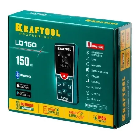 Лазерный дальномер KRAFTOOL LD-150 дальность 5см - 150м, точность 1.5 мм 34767 - это высокоточный прибор для точного измерения линейных расстояний, площадей и объёмов. Позволяет проводить весь цикл измерений одному человеку, значительно ускоряя выполнение разметочных работ и повышая надёжность полученных данных. Есть возможность использования камеры смартфона в виде видоискателя. С помощью лазерного дальномера можно быстро и точно определить размеры помещения. А с помощью программы Measure Mate получить его план в цифровом виде на экране смартфона (программа доступна для скачивания в App Store и Google Play). Функция Bluetooth позволяет управлять прибором с телефона через специальное приложение. Автоматическое отключение лазерного луча (через 30 сек.) и дальномера (через 60 сек.) дает возможность экономить заряд батарей. Ударопрочный корпус устойчив к влаге, пыли и механическим повреждениям.