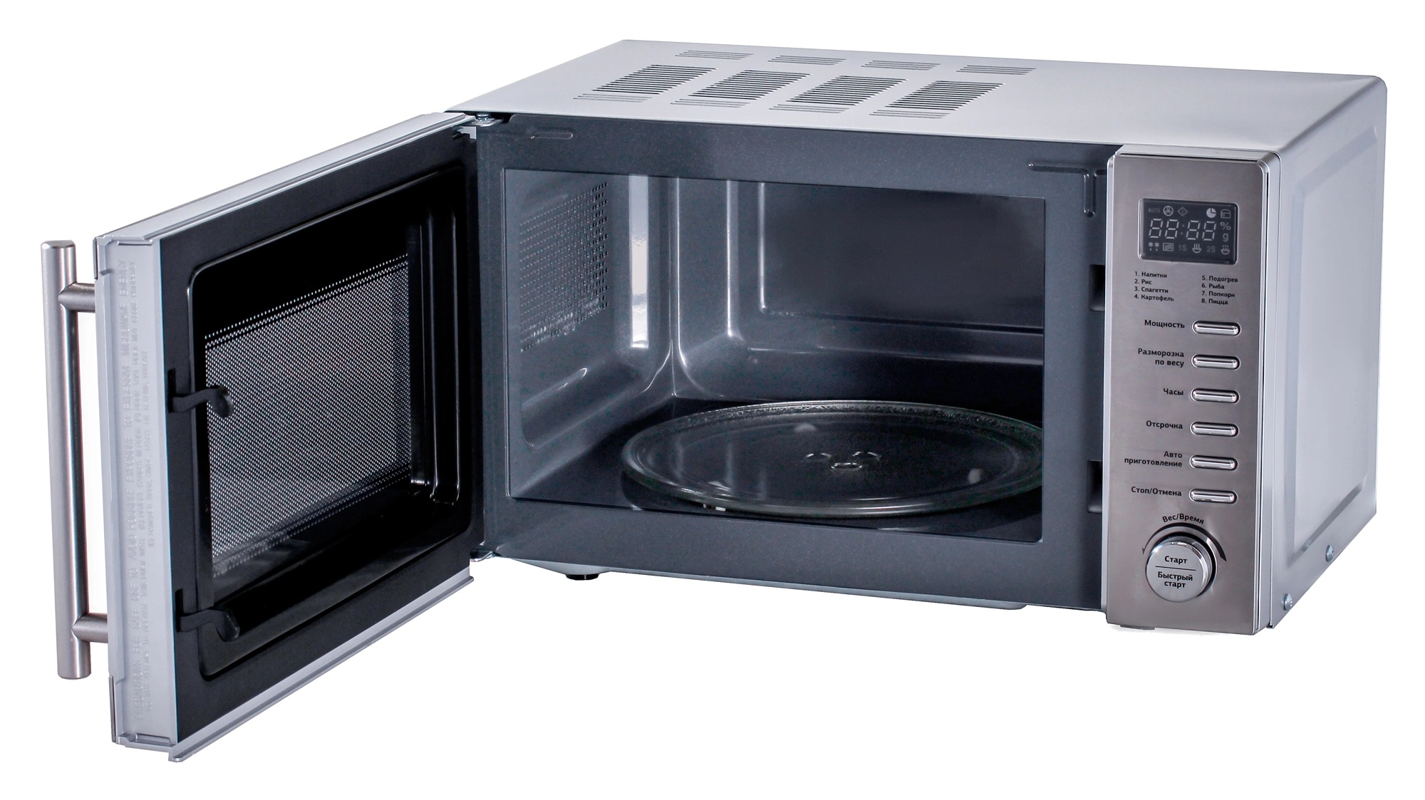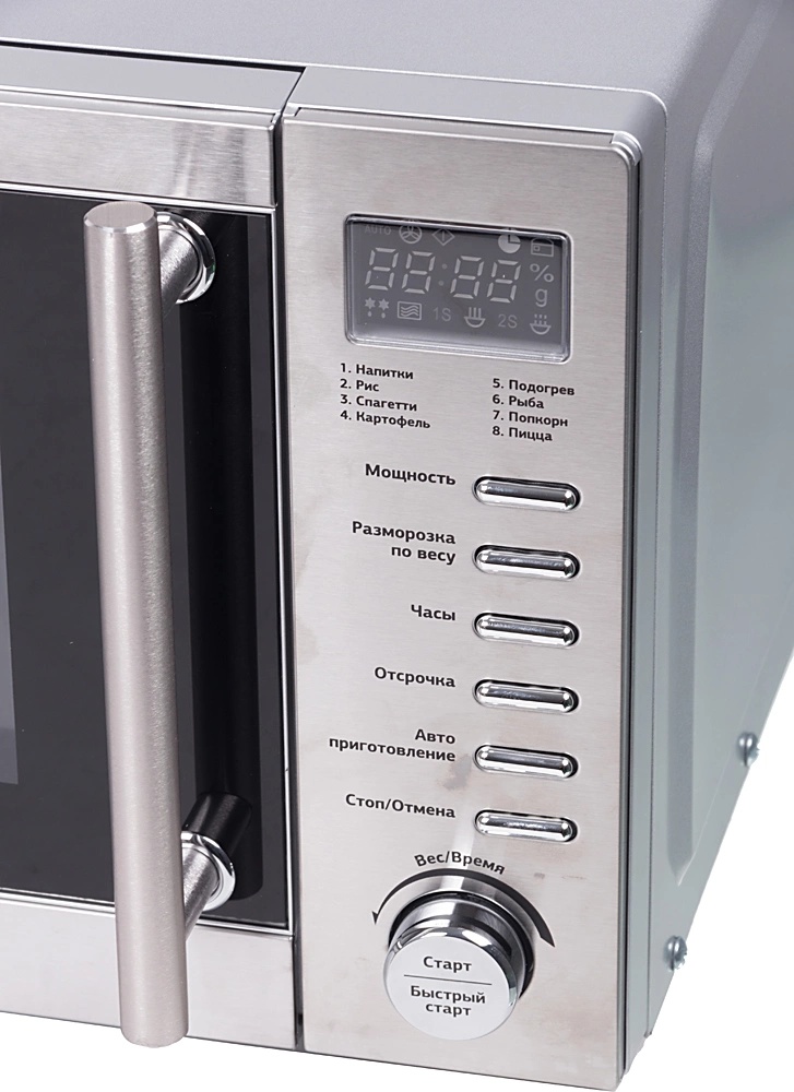 Отдельно стоящая, печь сВЧ, объем 20 л, тактовое управление, внутреннее покрытие эмаль, тип открывания дверцы ручка, автоматическое приготовление, автоматическое размораживание, звуковой сигнал отключения, внутренняя подсветка, часы, защита от детей, ширина 45 см, цвет серебристый.