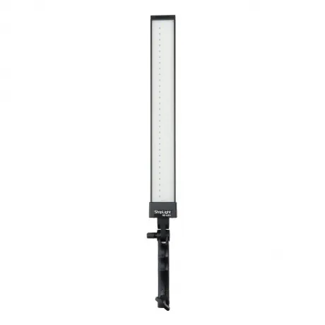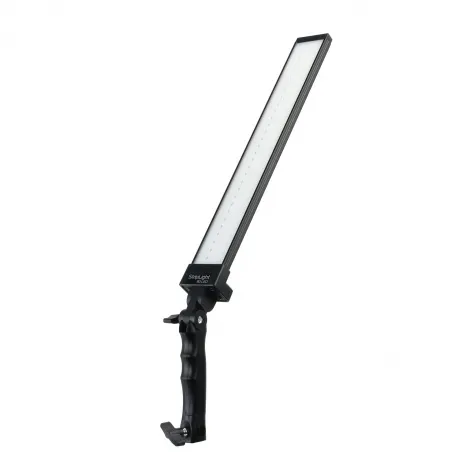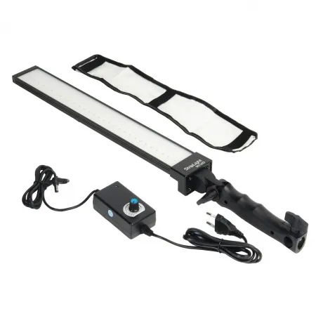 90 SMD-светодиодов, мощность 24 Вт, плавная регулировка яркости от 10 до 100%, цветовая температура 5600К, индекс цветопередачи CRI>90, установка на шпигот 5/8, поворотный кронштейн ±90°, тканевый рассеиватель, сетевой адаптер в комплекте. Размер осветителя 610х58х40 мм, вес 370 г.