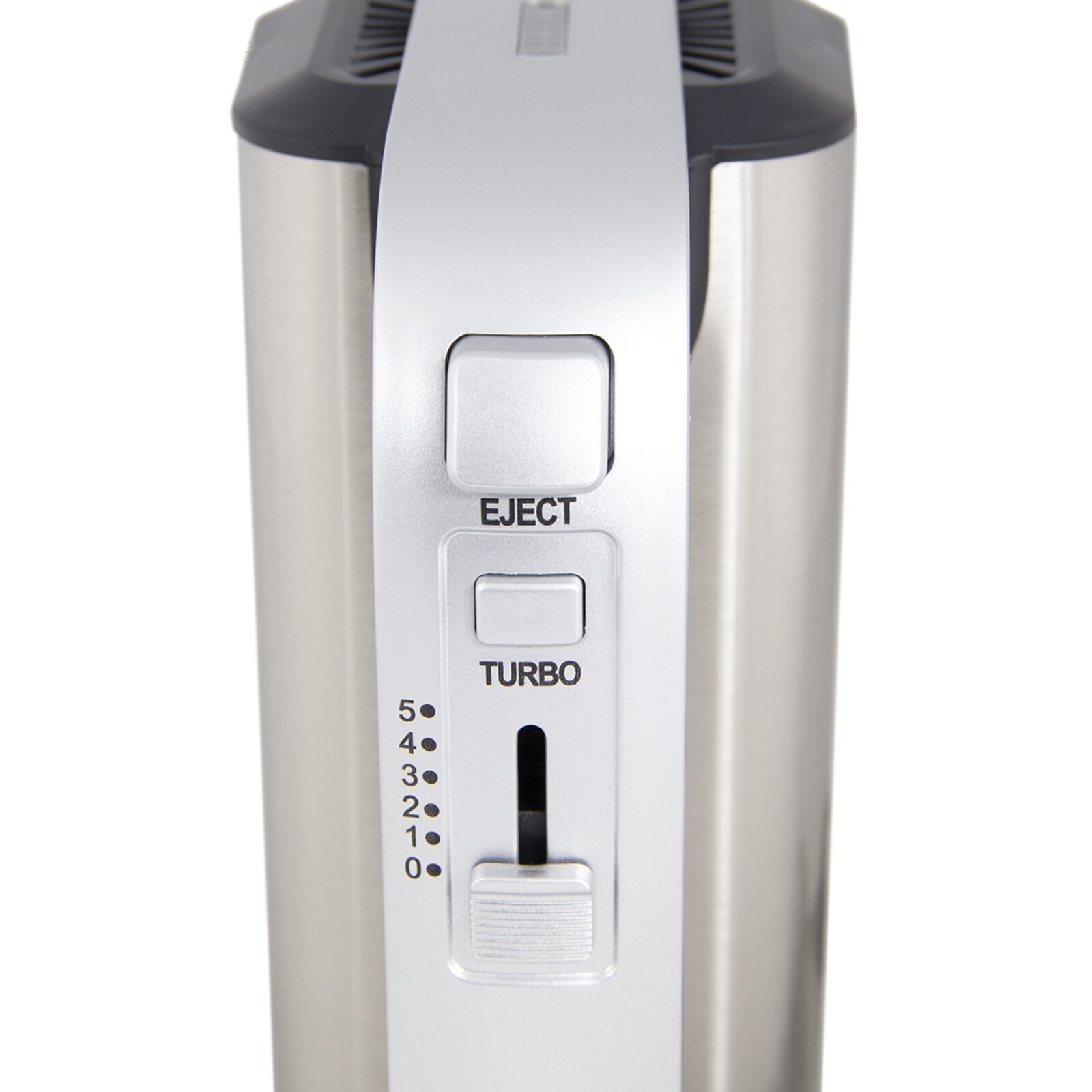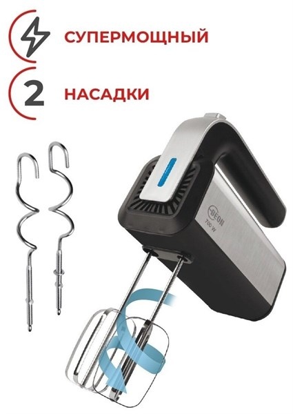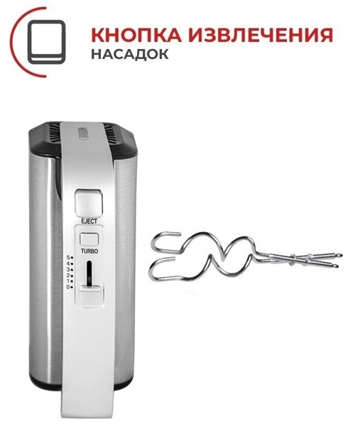 Турборежим. LED-подсветка. Корпус из нержавеющей стали. 2 венчика и крюка для теста. Кнопка извлечения насадок.
