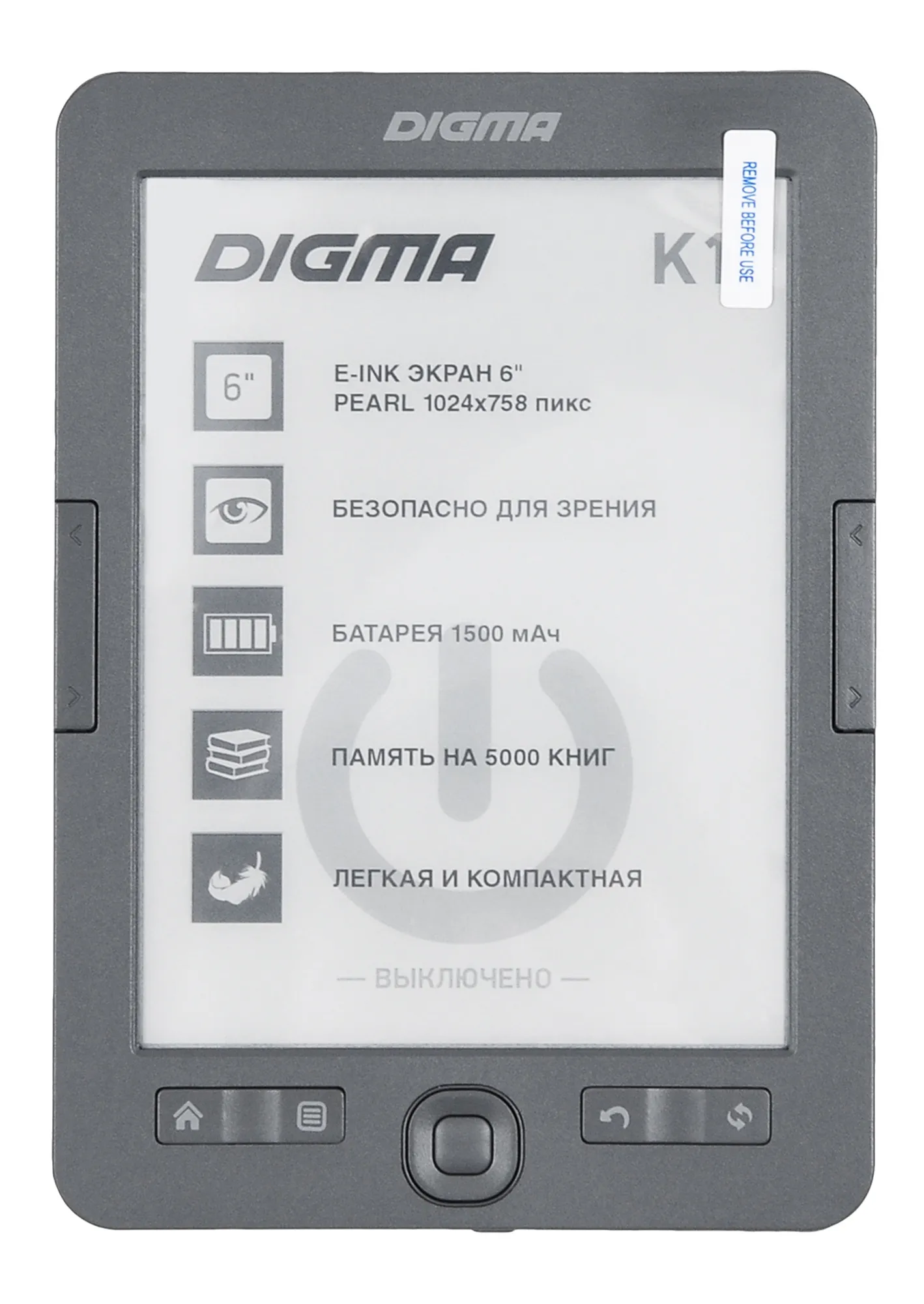 Не мыслите свою жизнь без регулярного чтения различных произведенийx Электронная книга Digma K1 в компактном корпусе станет вашей бессменной спутницей. Благодаря оперативной памяти в 128 Мб устройство без единого промедления загрузит необходимый пользователю файл. Электронная книга Digma K1 оснащена 6-дюймовым экраном. Встроенная память представленной модели объемом 4 Гб с возможностью последующего расширения посредством соответствующей карты позволит вам скачать и хранить различные издания, наслаждаясь их чтением во время отдыха или поездки. Аккумулятор емкостью 1500 мАч обеспечит продолжительное автономное функционирование аксессуара. Благодаря поддержке множества различных форматов у вас не возникнет трудностей при скачивании и открытии различных книг.