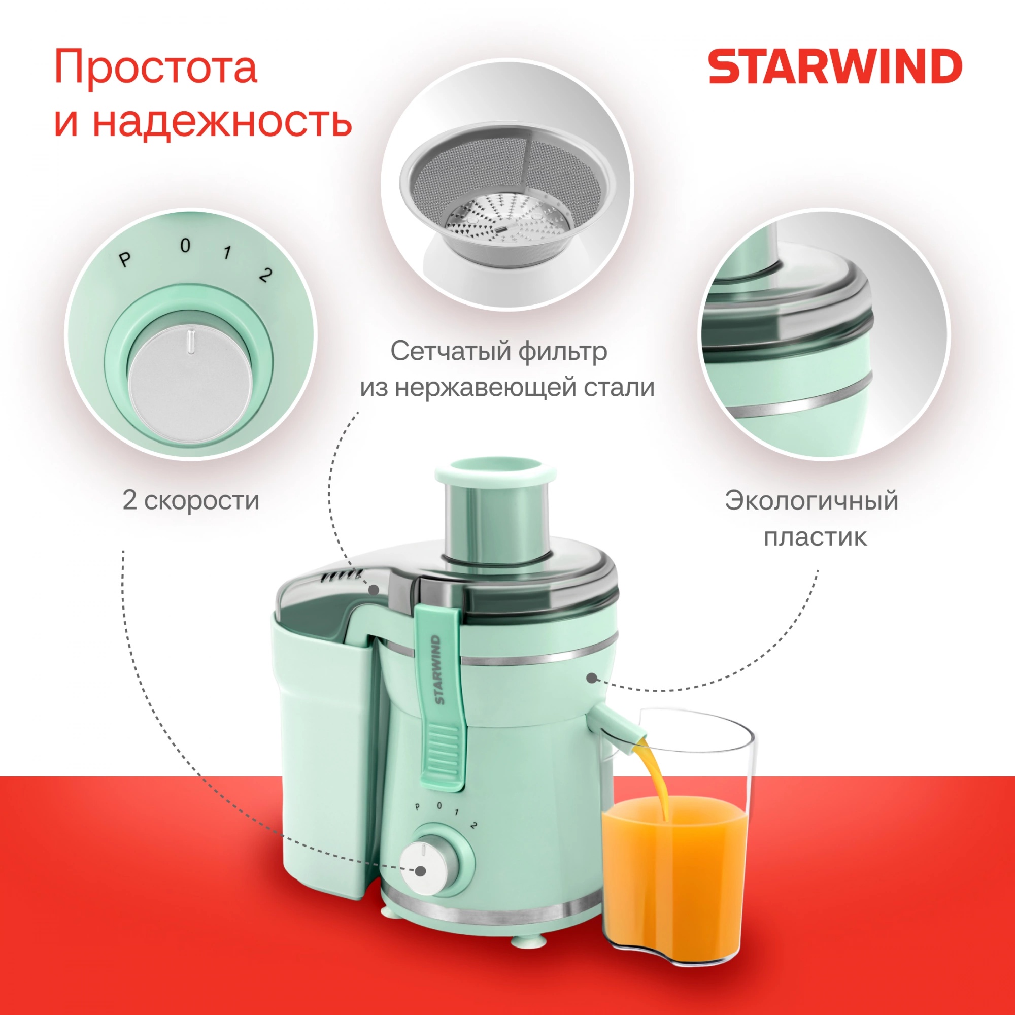 Также Starwind SJ2326 оснащён полезной функцией «капля-стоп», который препятствует появлению пятен под соковыжималкой.