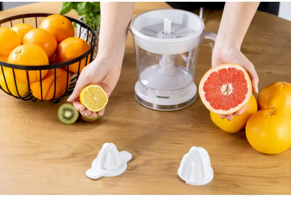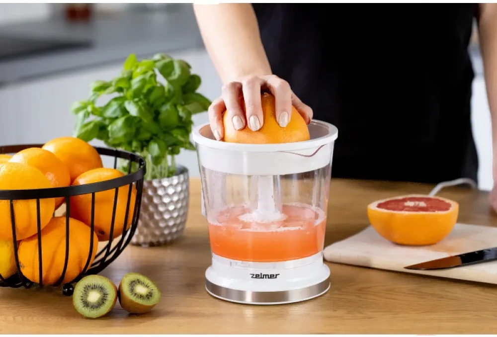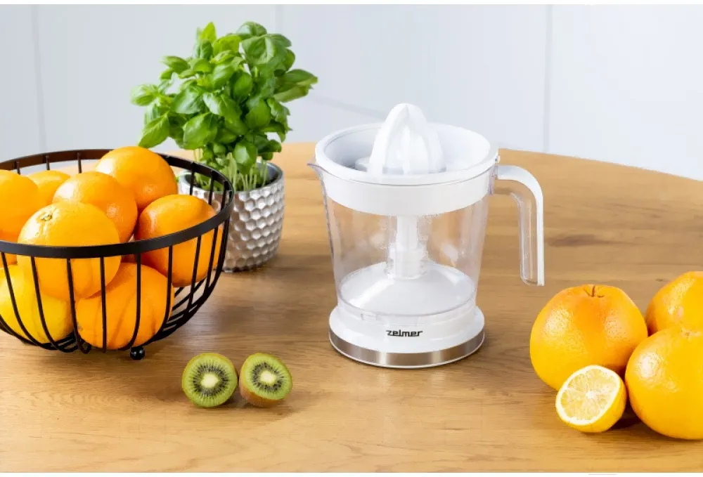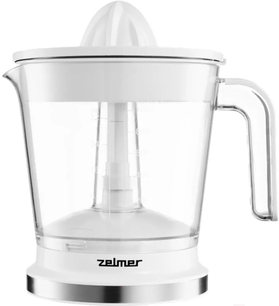 Соковыжималка для цитрусовых ZELMER ZJE2800 – максимально простая в использовании соковыжималка для цитрусовых, которая значительно упростит приготовление вкусного и полезного фреша. От вас лишь требуется подключить сетевой шнур прибора к розетке, а затем разрезать апельсин, лимон или грейпфрут на половинки, взять одну из них и надавить на конусообразную насадку, после чего она начнёт автоматическое вращение. Весь напиток скапливается в съёмном кувшине объёмом 1 л. Ёмкость снабжена эргономичной ручкой, удобным разливочным носиком и наглядной градуированной шкалой. Корпус кухонного помощника очень устойчив, поэтому он не завалится на бок в процессе эксплуатации и не упадёт на пол. Комплектация: соковыжималка цитрусовая, конус насадки для выжимания: 2 разных размера для крупных и мелких плодов, инструкция.