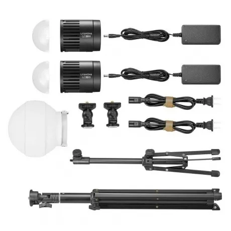 осветитель светодиодный Godox Litemons LC30D – 2 шт., держатель AH-01 – 2 шт., адаптер питания от сети – 2 шт., кабель питания от сети – 2 шт., настольный штатив Godox DT-TP01, штатив Godox 160F, рассеиватель сферический Godox ML-CD15, рассеиватель Godox AK-R11 – 2 шт., сумка Godox СВ70