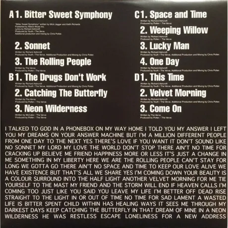 Bitter Sweet Symphony, Sonnet, The Rolling People, The Drugs Don't Work, Catching The Butterfly, Neon Wilderness, Space And Time, Weeping Willow, Lucky Man, One Day, This Time, Velvet Morning, Come On