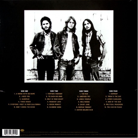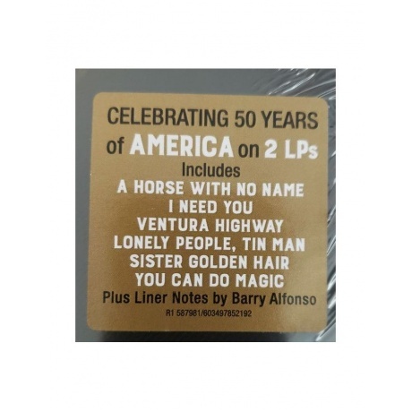 Юбилейный сборник золотых хитов на двойном виниле британского фолк-рок-трио America. Группа празднует свой полувековой юбилей в этом году с трио компиляций, которые показывают, как она попала на вершины поп-чартов, прошла через музыкальные эпохи, и завоевала сердца бесчисленных поклонников. Группа мультиплатиновых продаж, возглавляемая основателями Джерри Бекли и Дьюи Баннеллом и известная своими запоминающимися и динамичными живыми выступлениями, также объявила несколько юбилейных концертов. America - фолк-рок трио было организовано в Лондоне в 1970 году, сыновьями американских военных, дислоцированных в Англии. Мультиинструменталисты-вокалисты Джерри Бекли, Дьюи Баннелл, Дэн Пик познакомились в конце 60х годов в Центральной высшей школе Уотфорда, где они учились и играли в местной группе Daze. После окончания учебы было образовано трио America и через год выпущен одноименный альбом, попавший на первое место в американском хит-параде. Такой же успех повторил и дебютный сингл A Horse With No Name в 1972 году. В 1973 году группа получила награду Грэмми, как лучший новый артист 1972 года. В 1974 году с группой начал работать Джордж Мартин, который стал продюсером пяти альбомов трио. В 1977 году трио покинул Дэн Пик, который занялся сольной карьерой, хотя иногда и присоединялся к группе на некоторые концертные выступления.