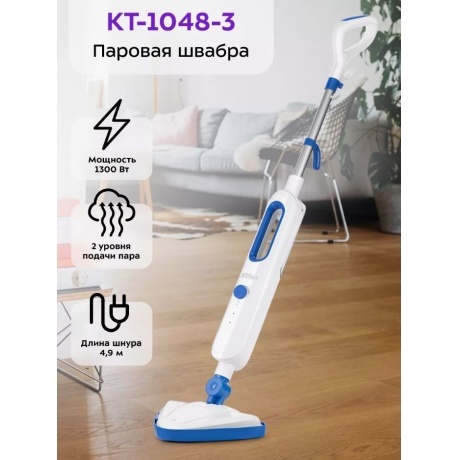 Паровая швабра КТ-1048 — универсальное устройство, которое поможет избавиться от пыли и грязи с помощью мощной струи пара, а также продезинфицирует поверхность. Высокая температура пара способствует процессу очистки любых загрязнений. Плавная регулировка уровня подачи пара позволяет настраивать интенсивность работы устройства. Это очень удобно при очистке разных типов поверхностей с разным уровнем загрязнения. Чем сильнее загрязнение, тем больше пара потребуется. Швабра КТ-1048 оснащена специальной конструкцией, благодаря которой вы сможете легко вымыть пол под мебелью. Принцип действия парогенератора основан на воздействии горячего пара на загрязнения. Пар проникает внутрь загрязнения, размягчая и растворяя его. Напольная щётка закреплена на специальном шаровом шарнире с наклоном в двух плоскостях, что делает швабру КТ-1048 очень маневренной и значительно облегчает уборку. Насадка для пола надёжно фиксируется шурупом, который идёт в комплекте. Во время работы парогенератора вода из резервуара проходит через специальный фильтр. Швабра оснащена резервуаром для воды ёмкостью 360 мл, что позволит убрать большую площадь сразу. Конструкция удобно разбирается, чтобы наполнить и вымыть резервуар. Стакан для наливания воды служит для удобного и безопасного наливания воды в резервуар. В комплекте идут рамка для ковра, 2 тряпки для пола, удлинительная трубка, ручка, шуруп для фиксации насадки и резервуар для воды с крышкой. Помимо гладких поверхностей, паровая швабра также убирает ковровые покрытия с недлинным ворсом. Комплектацией швабры предусмотрена рамка, она крепится на щётку и тряпку. Рамка облегчает скольжение щётки по ковру и предотвращает задирание краёв тряпки. Паровая швабра КТ-1048 обладает функцией вертикальной парковки, так что вам необязательно ставить её в шкаф. На удлинительной ручке предусмотрены держатели для шнура для ещё более компактного хранения. Длина шнура – 4.9 метра.
