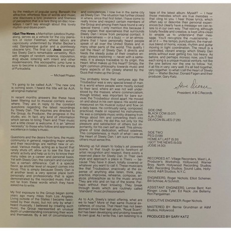 "Aja" - Шестой студийный альбом американской джаз-рок-группы Steely Dan, вышедший 23 сентября 1977 года. Диск достиг 3-го места в США и 5-го в Великобритании и получил 23 февраля 1978 года премию Грэмми в категории Best Non-Classical Engineered Recording. В 2003 году журнал "Rolling Stone" включил этот альбом под № 145 в список «500 величайших альбомов всех времён по версии журнала "Rolling Stone". Альбом получил положительные отзывы музыкальных изданий и критиков, включая Allmusic, Robert Christgau, BBC Music, Rolling Stone. Ремастированное переиздание на черном виниле в разворотном конверте. Steely Dan - арок-группа, исполняющая сложный, нестандартный джаз-фьюжн с элементами софт-рока, фанка, ритм-энд-блюза. Составлявшие основу коллектива Уолтер Беккер и Дональд Фейген предпочитали студийную работу и редко выступали с концертами; в своих умных и необычных текстах они нередко касались "тёмных"сторон жизни (наркотики, криминал и т. д.). Steely Dan имели стабильный успех в 1970-х годах, но впоследствии получили от журнала Rolling Stone определение "идеальные антигерои в музыке 70-х". Группа распалась в 1981 году, но реформировалась двенадцать лет спустя и возобновила концертную и студийную деятельность.