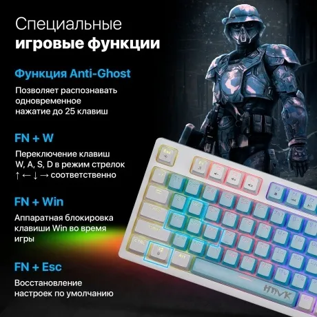 Стильная механическая клавиатура с кейкапами двух цветов и тихими красными свитчами. Главные особенности модели: радужная подсветка, возможность замены свитчей, благодаря технологии Hot Swap, а также наличие кнопки-регулятора для управления громкостью и подсветкой.