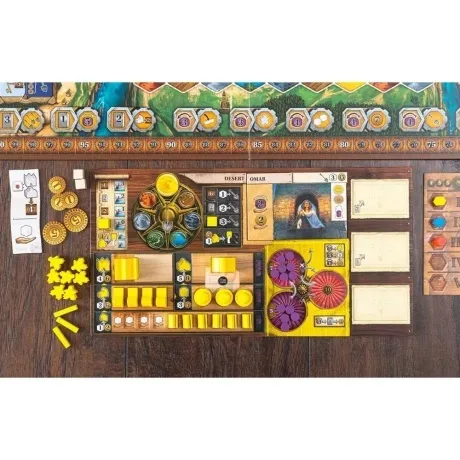 1 Game board, 1 Turn Order display, 48 Books (12 per color), 56 Terrain tiles (2-sided) with 7 different terrains, 6 different Book Action tiles, 21 City tiles (7 different, 3 of each), 12 different Factions, 5 Action overviews, 1 Science display, 7 Planning displays, 7 Planning Display cards, 2 additional Innovation display sections, 10 Round Bonus tiles, 4 Area Score tiles for the 2-player game, 48 Competency tiles (12 different, 4 of each), 1 Innovation display base section, 12 different Roun