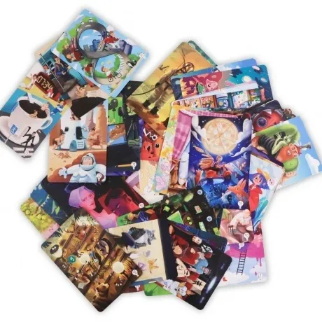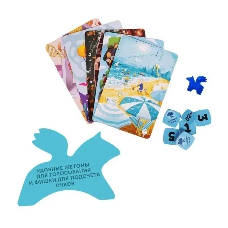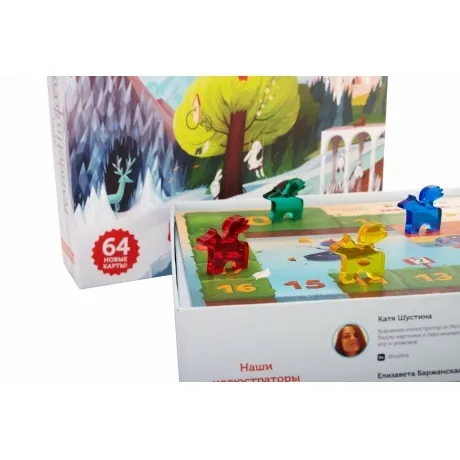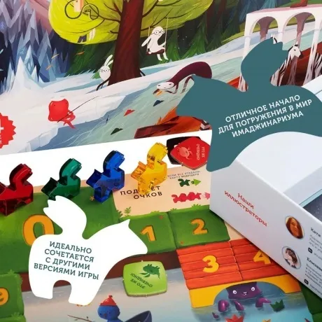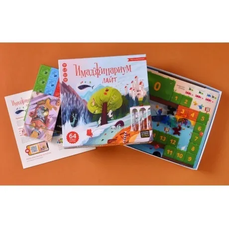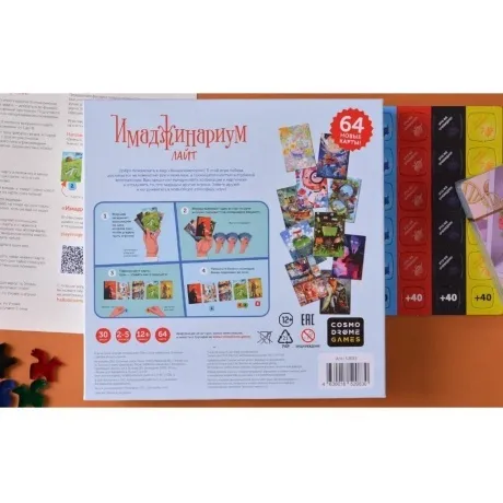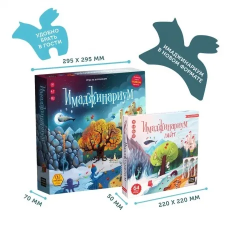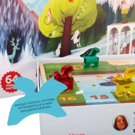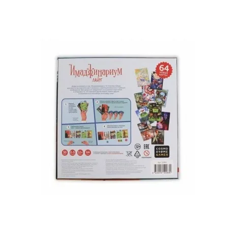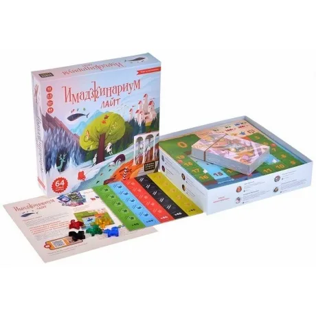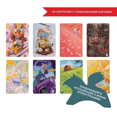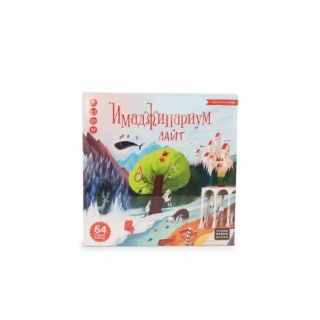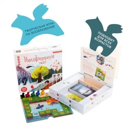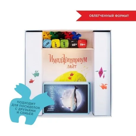 «Имаджинариум: Лайт» — простая и весёлая игра на ассоциации. Здесь победа достигается не ловкостью рук и везением, а проницательностью и глубиной воображения! Во время партии вам предстоит придумывать свои ассоциации к картинкам и отгадывать те, что загадали другие игроки.Если вы ещё не пробовали «Имаджинариум», то «Лайт» станет отличным началом погружения в мир фантазии! А если играли, то он прекрасно впишется в вашу коллекцию, дополняя базовые или сумчатые версии. Этот облегченный формат «Имаджинариума» идеален для встреч с друзьями, посиделок с семьёй и вечеров с коллегами. А ещё его удобно брать в гости — небольшая коробочка легко помещается в рюкзак или сумку.В набор вошли 64 уникальные иллюстрации от наших художников. Других таких же забавных, немного пугающих и заставляющих задуматься, карточек вы не встретите. Просто взгляните на них, и у вас появится миллион ассоциаций!Пять волшебных пегасов станут вашими фишками игроков и проведут по фантастическому миру Имаджинариума. Отгадывайте чужие ассоциации, загадывайте свои так, чтобы вас поняли только несколько человек, и продвигайте своих пегасов вперёд по игровому полю, чтобы долететь до финиша раньше остальных игроков.Как и все «Имаджинариумы», «Лайт» идеально сочетается с любыми дополнениями — включая те, что мы ещё не выпустили. Так что игра не скоро надоест!Открывайте коробочку, седлайте пегасов и отправляйтесь в путешествие по самым невероятным мирам!Цель игры — провести своего слона по игровому полю дальше остальных игроков. Для этого потребуется подбирать ассоциации к своим картам и угадывать карты других игроков по их ассоциациям. Побеждает тот, кто лучше остальных распознаёт карты других игроков, а сам загадывает узнаваемые, но не самые очевидные ассоциации. Так, чтобы хотя бы один игрок понял, какую карту вы загадали, а хотя бы один — не угадал.