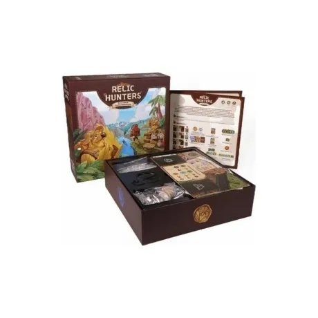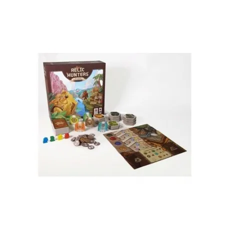 Этот остров хранит древние реликвии. Извлечь их из недр земли без хорошо подготовленной экспедиции очень сложно. К счастью для вас, на юге острова обитает множество опытных авантюристов, готовых в очередь выстроиться, лишь бы помочь вам. разумеется, за некоторую плату. Нет денегx Не беда. Проведите небольшое исследование местности — и сможете раздобыть достаточно монет для найма необходимых участников. Направьте свою экспедицию на север и выкопайте спрятанную реликвию! Но сделайте это раньше, чем ваши конкуренты…. «Охотники за реликвиями» — это динамичная колодостроительная игра-гонка с очаровательными иллюстрациями. В ней вы будете использовать карты из своей колоды, чтобы перемещать фишки по жетонам местности. Посетив и перевернув жетон, вы можете найти сокровище (бесплатная награда), место для раскопок (награда, для получения которой нужно сыграть дополнительные карты) или реликвию (нужна для победы). Вы можете вернуться в лагерь, чтобы улучшить и пополнить колоду. Побеждает тот, кто первым выкопает 2 реликвии, спрятанные среди жетонов 3-го уровня.