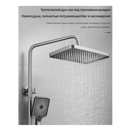 Регулируемая по высоте штанга верхнего душа. Поворотная лейка верхнего душа на 360°. 3 режима ручной лейки: дождь, пульсация и смешанный. Излив можно повернуть на 90°, чтобы освободить пространство (экономия места). Удобная полочка для мыльных принадлежностей. Контроль температуры воды