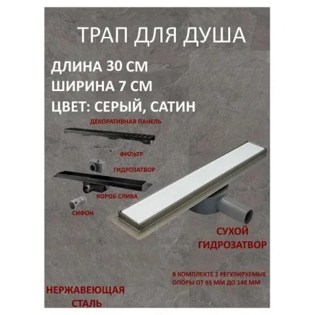 Трап (лоток) под плитку с горизонтальным выпуском из нержавеющей стали HAIBA, 70мм х 300мм Линейный трап под кладку плитки для душа предназначен для отвода воды с пола или поддона под душем. Широкий диапазон регулировки по высоте позволяет устанавливать трап в новых ванных комнатах. Трап обеспечивает свободный слив воды в канализационную систему, также собирая мусор, не давая ему засорять сливные каналы. Принцип работы сухого затвора: легкий поплавок диаметром больше сливного отверстия опускается и закрывает трубу в случае высыхания воды.
