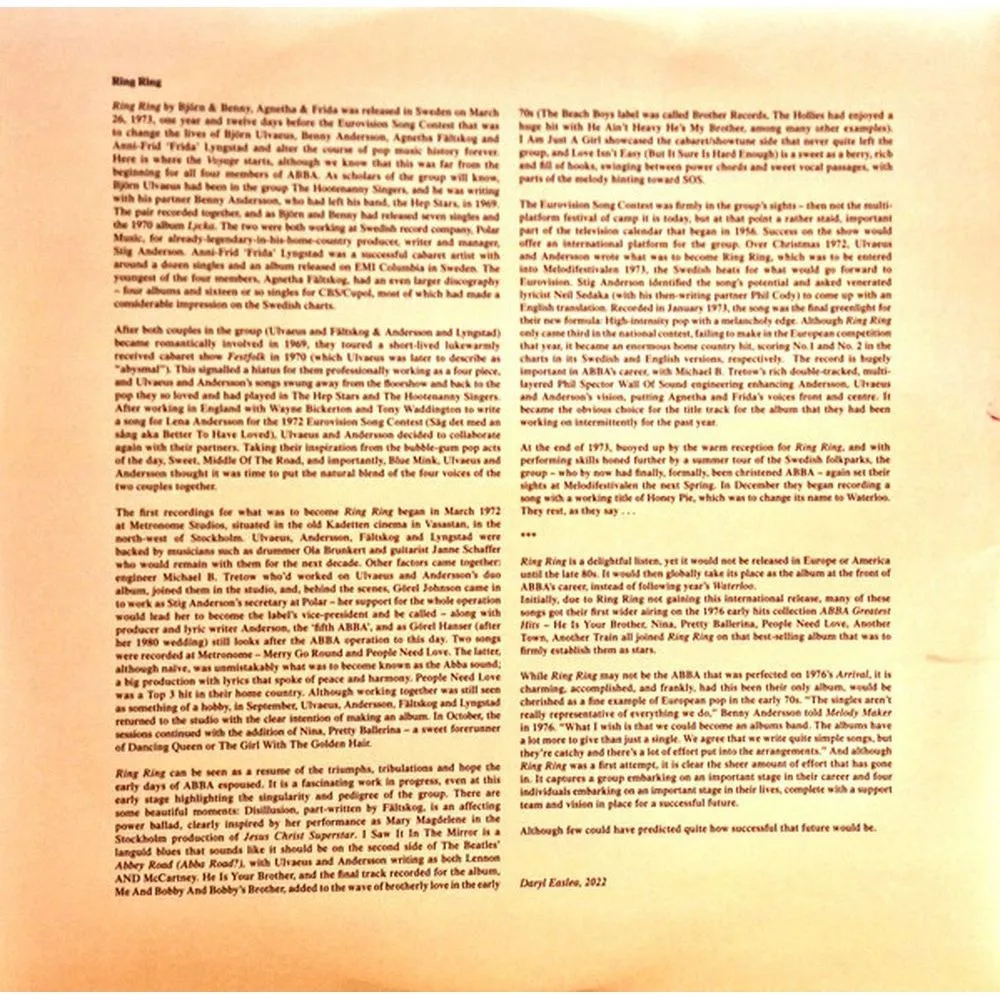 Лицензионное издание, выпущенное на виниле. В альбом вошли следующие композиции: Ring, Ring - Swedish Version, Another Town, Another Train, Disillusion, People Need Love, I Saw It In The Mirror, Nina, Pretty Ballerina, Love Isn't Easy (But It Sure Is Hard Enough), Me And Bobby And Bobby's Brother, He Is Your Brother, Ring Ring - English Version, I Am Just A Girl, Rock'N'Roll Band
