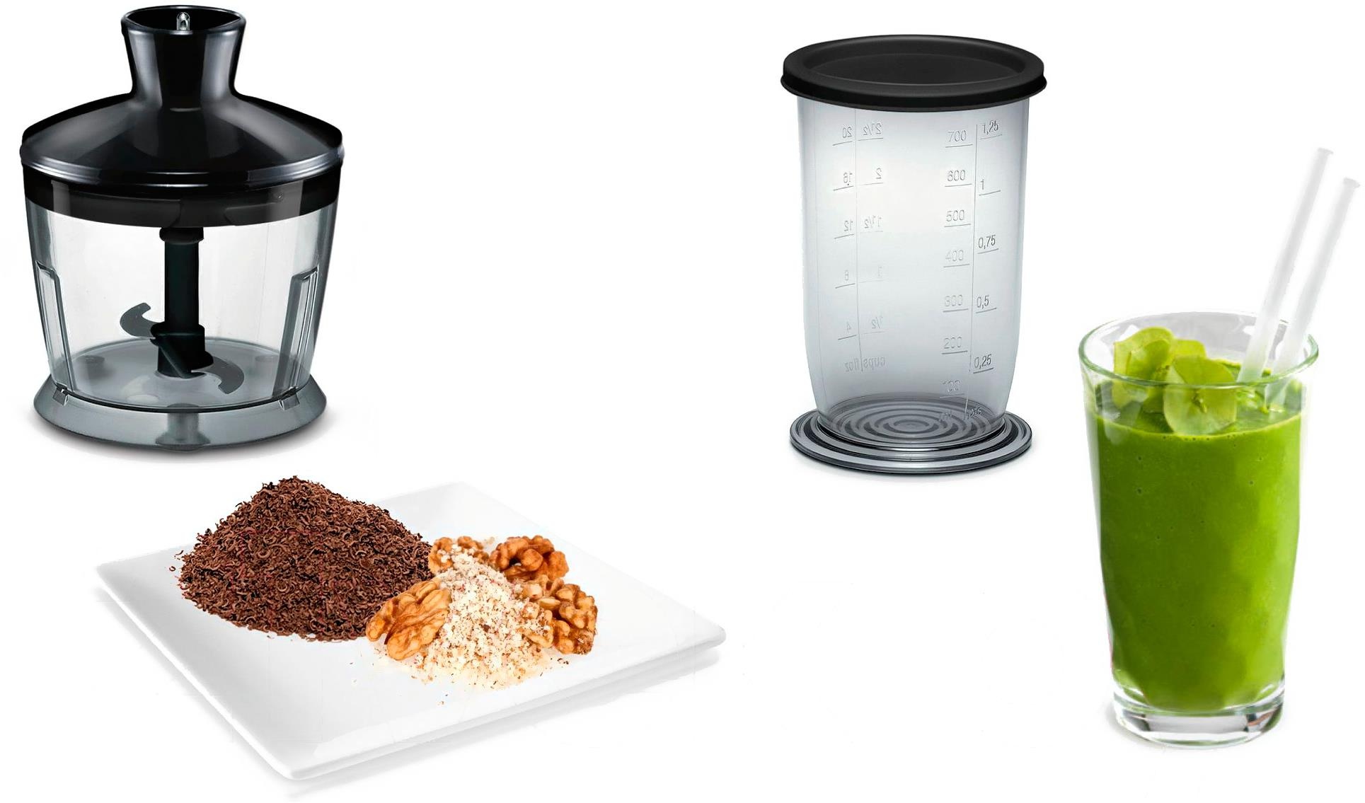 Блендер Bosch MSM 2620B погружной Готовить с удовольствием при помощи погружного блендера Bosch CleverMixx. Надежный погружной блендер Bosch CleverMixx MSM 2620B гармонично сочетает в себе великолепный дизайн и современные технологии. Прибор оснащен мощным мотором 600 Вт, а также оборудован инновационным ножом с технологией QuattroBlade, благодаря чему позволяет быстро и эффективно измельчать и смешивать различные ингредиенты. Специальная конструкция погружной насадки предотвращает разбрызгивание во время смешивания. Эргономичная ручка блендера с удобным управлением гарантирует максимальный комфорт в использовании. Наличие дополнительных насадок делает прибор универсальным помощником на кухне. Отличный результат за минимально короткое время: мощный мотор 600 Ватт. Благодаря эргономичной ручкой CleverMixx удобно лежит в руке, а малый вес делает его удобным в использовании. Смешивает и измельчает качественно и без брызг благодаря специальной конструкции погружной части Измельчить пряные травы, чеснок, орехи, сыр пармезан с помощью насадки измельчителя: отличный соус "Песто" легко и быстро.